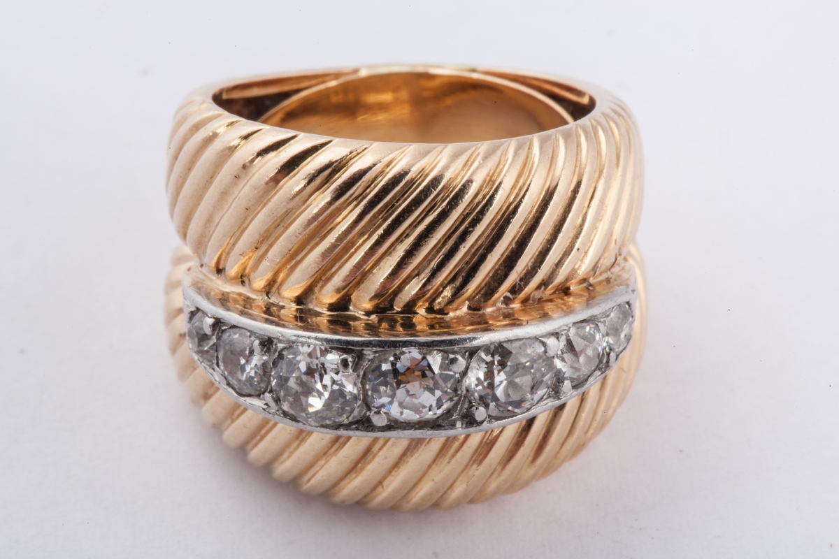 BAGUE deux-corps en or jaune décoré de cannelures, ornée, au centre, d'une ligne de diamants de taille ancienne en chute. Poids brut: 11 g. Tour de doigt: 48.