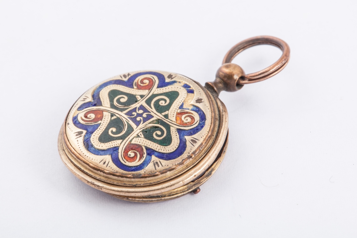 PORTE-SOUVENIR en or. Figurant au dos un motif oriental en émail cloisonné vert, rouge et bleu. Bélière.
