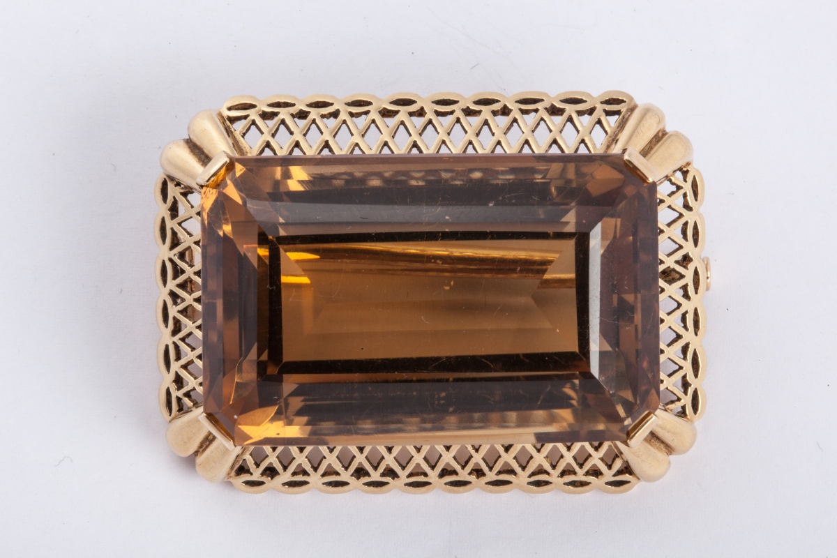 BROCHE de forme rectangulaire en or jaune ajouré, sertie d'une importante citrine rectangulaire à pans coupés.