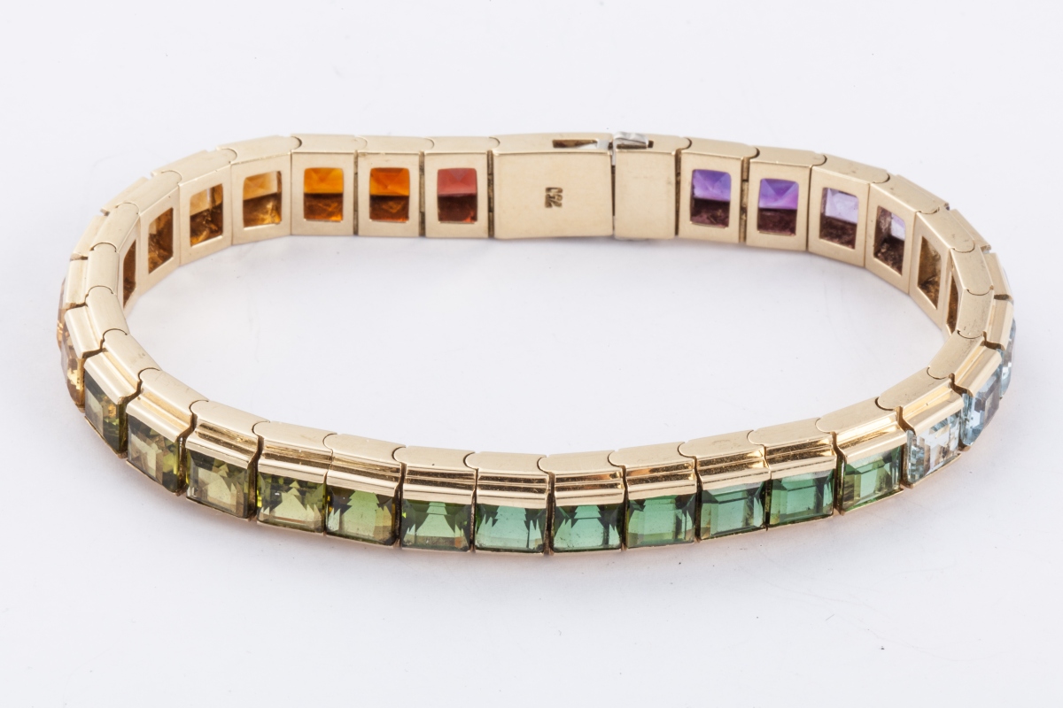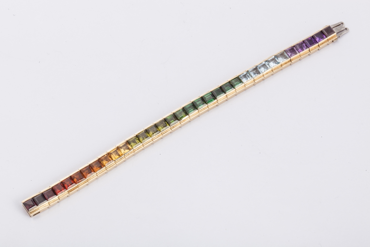 BRACELET articulé en or jaune, serti d'une ligne de trente-trois pierres fines diverses (améthyste, aigue-marine, tourmaline, péridot, citrine et grenat).