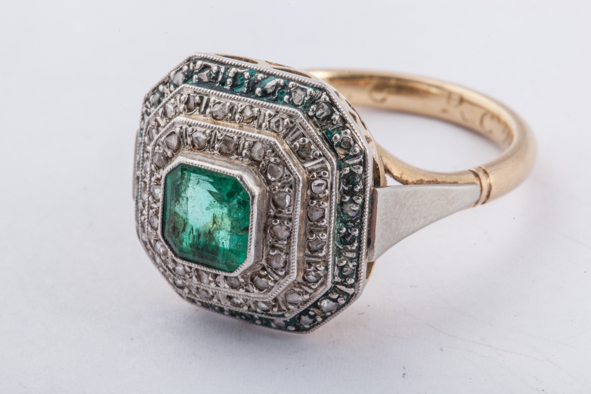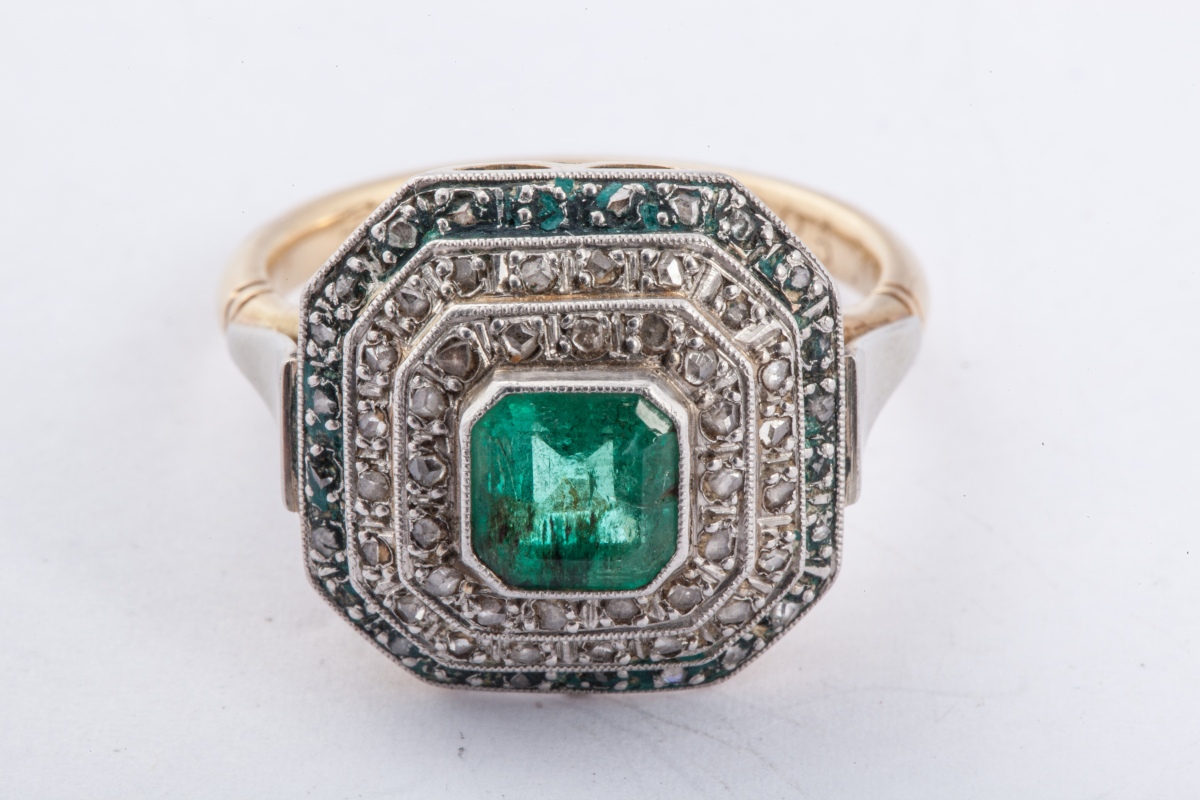 BAGUE, en or deux tons, ornée au centre d'une émeraude, en serti clos dans trois entourages à degrés de pierres blanches, de forme carrée à pans coupés.