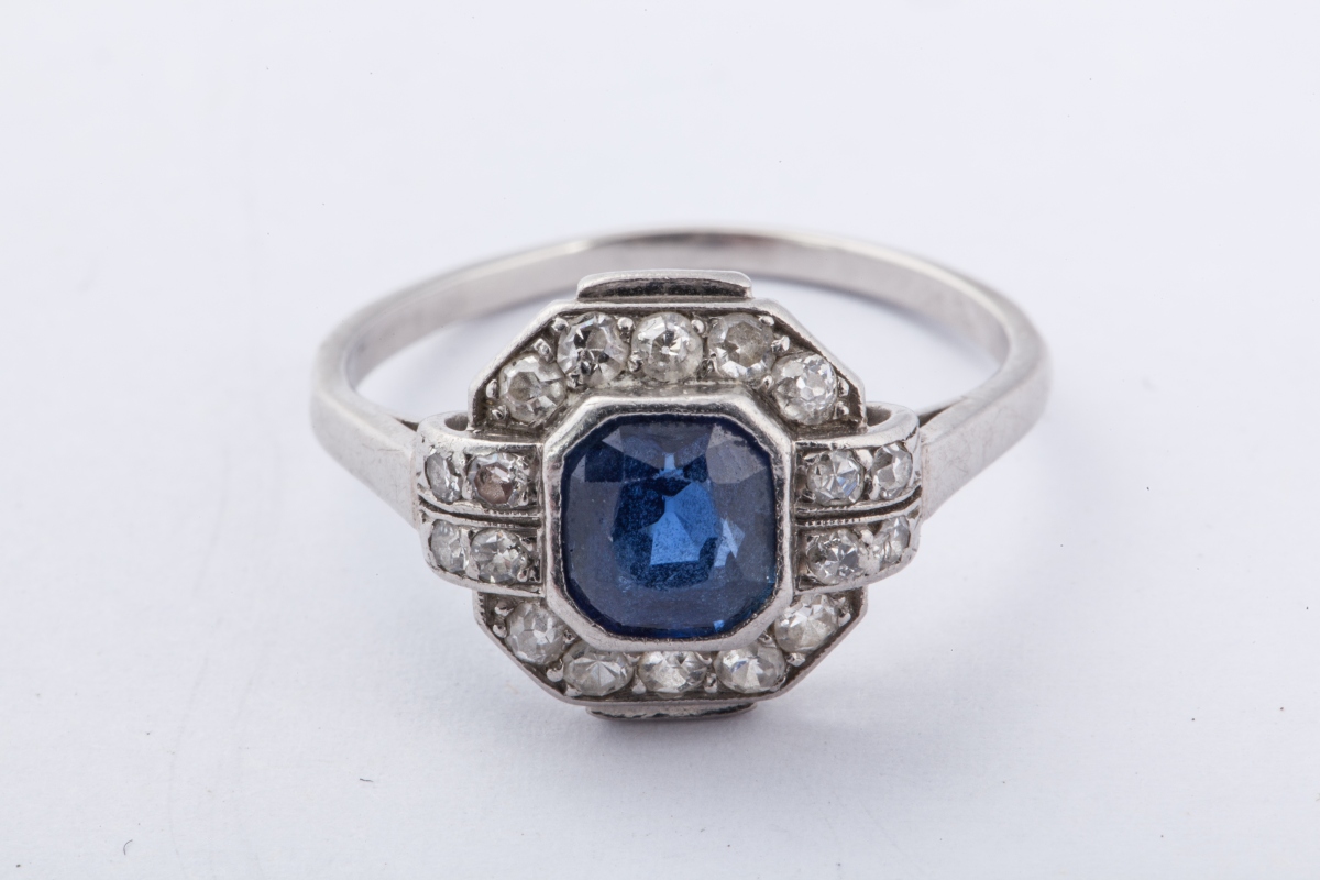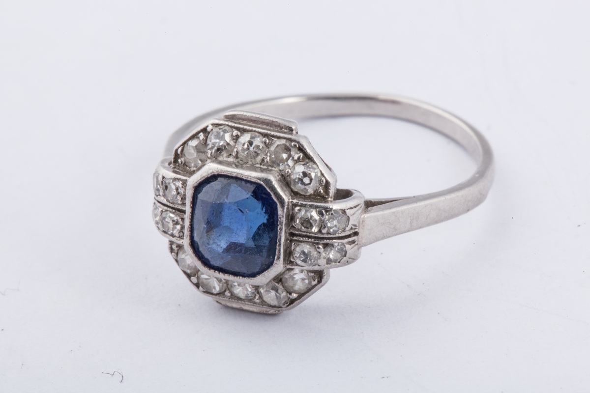 BAGUE en or gris, le chaton de forme carrée à pans coupés, ornée au centre d'un saphir, en serti clos dans un entourage de 10 pierres blanches, avec attaches.