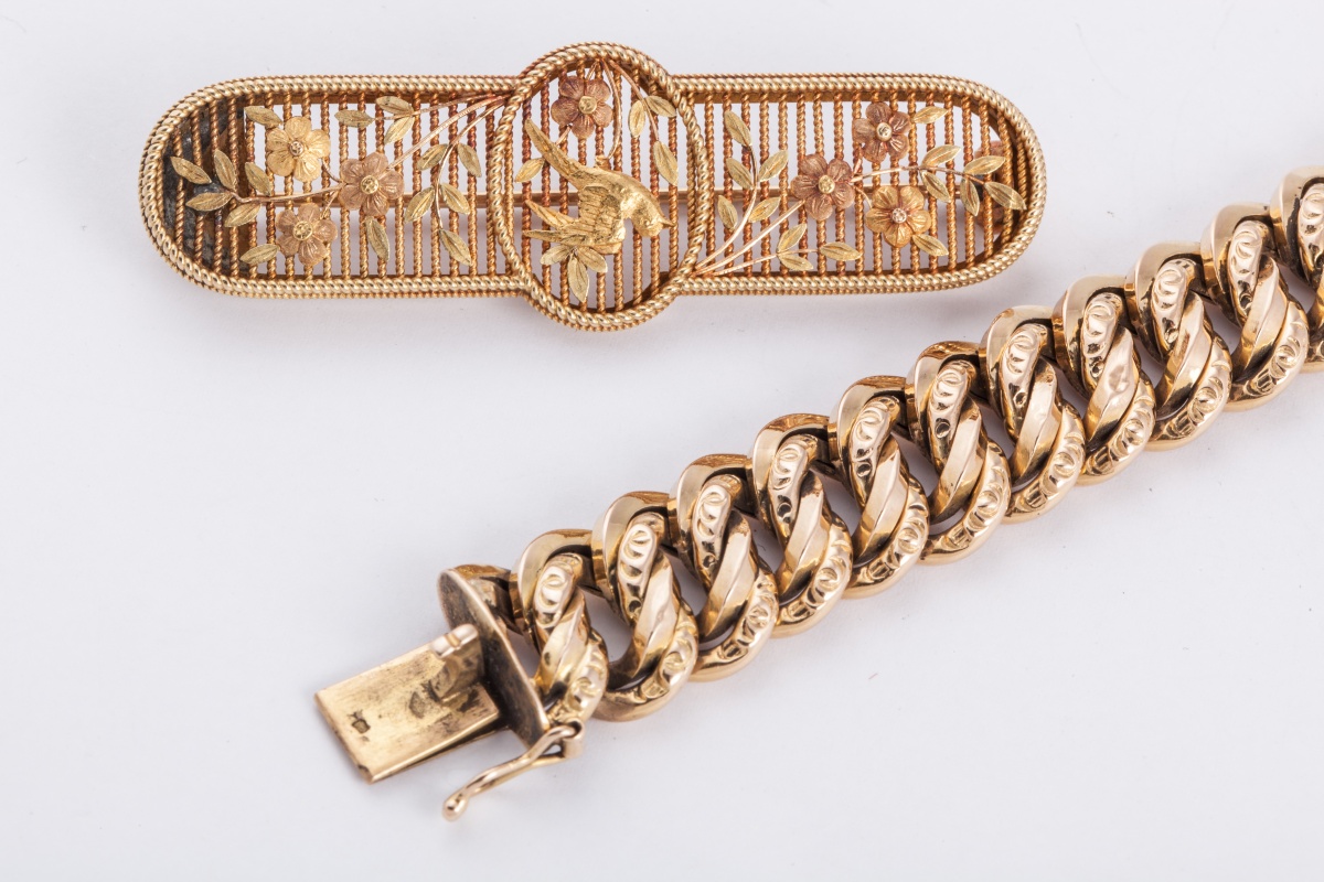 - BROCHE ajourée, centrée d'un motif ovale d'oiseau et fleurs, épaulé de deux branches de fleurs et végétaux, sur fond de fines baguettes d'or.