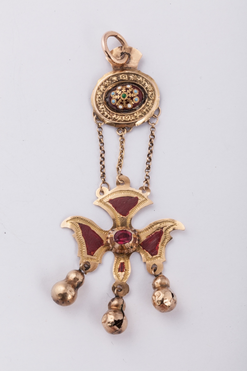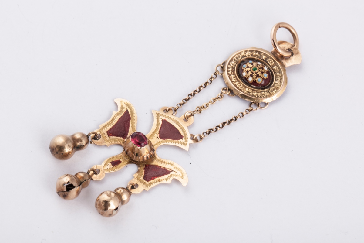 PENDENTIF SAINT ESPRIT dit "du Puy". La plaque ovale, ornée d'émail réhaussé d'or, dans un entourage d'une frise feuillagée. Le pendentif Saint Esprit, suspendu par 3 chaînettes, en or jaune émaillé rouge, centré d'une pierre rouge. 3 gouttes soutenues en pampilles. Anneau.