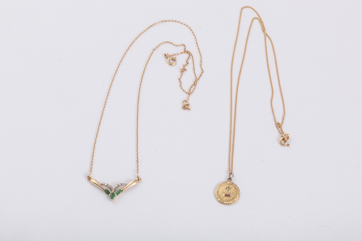 L'un avec médaille à l'inscription "+ QU'HIER - QUE DEMAIN" sur fond de guillochis dans un entourage de frise feuillagées. La chaîne en or jaune. Diam. 1,2 cm. Long. 26 cm.