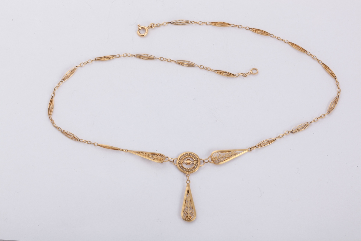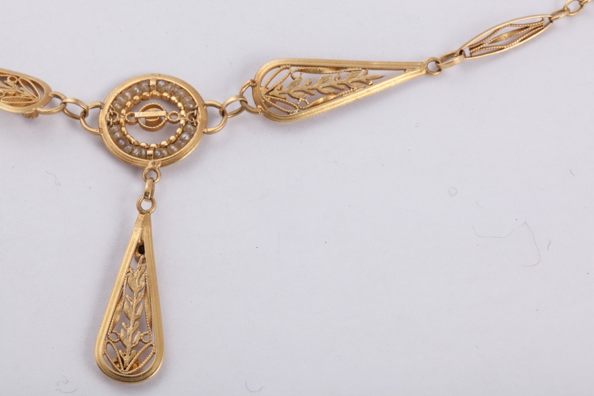 PENDENTIF en or repercé serti de 27 petites perles et de quatre rubis.