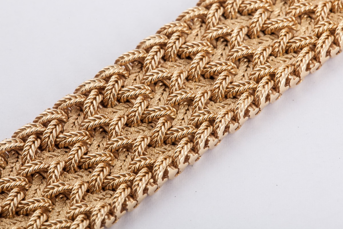 BRACELET ruban en or jaune, constitué de tresses en relief sur fond en amati mat.