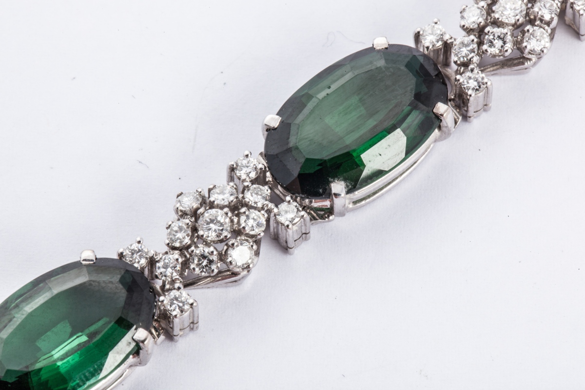 BRACELET en or blanc composé de 6 tourmalines vertes facettées et de 78 diamants taille brillant.