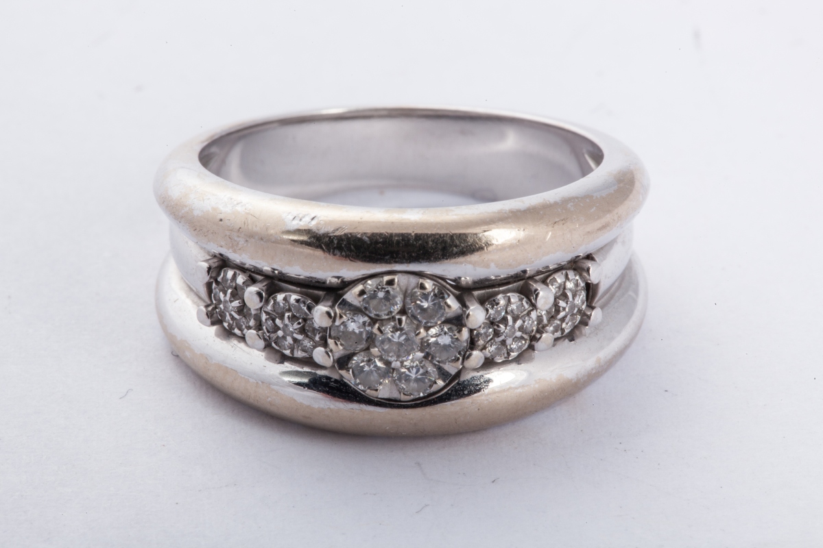 BAGUE en or gris sertie en son centre de 7 brillants en rosace épaulés de 28 petits brillants sertis en deux petites rosaces. Poids brut: 8,3 g.