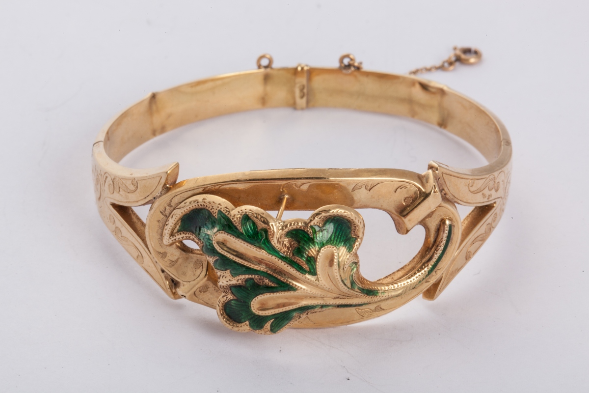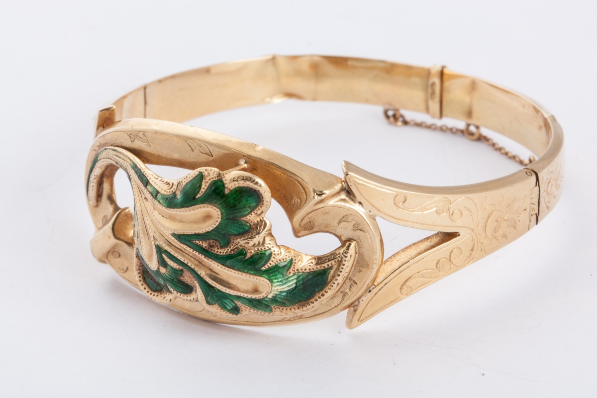 BRACELET en or jaune,articulé, à décors émaillé en vert d'un feuillage.