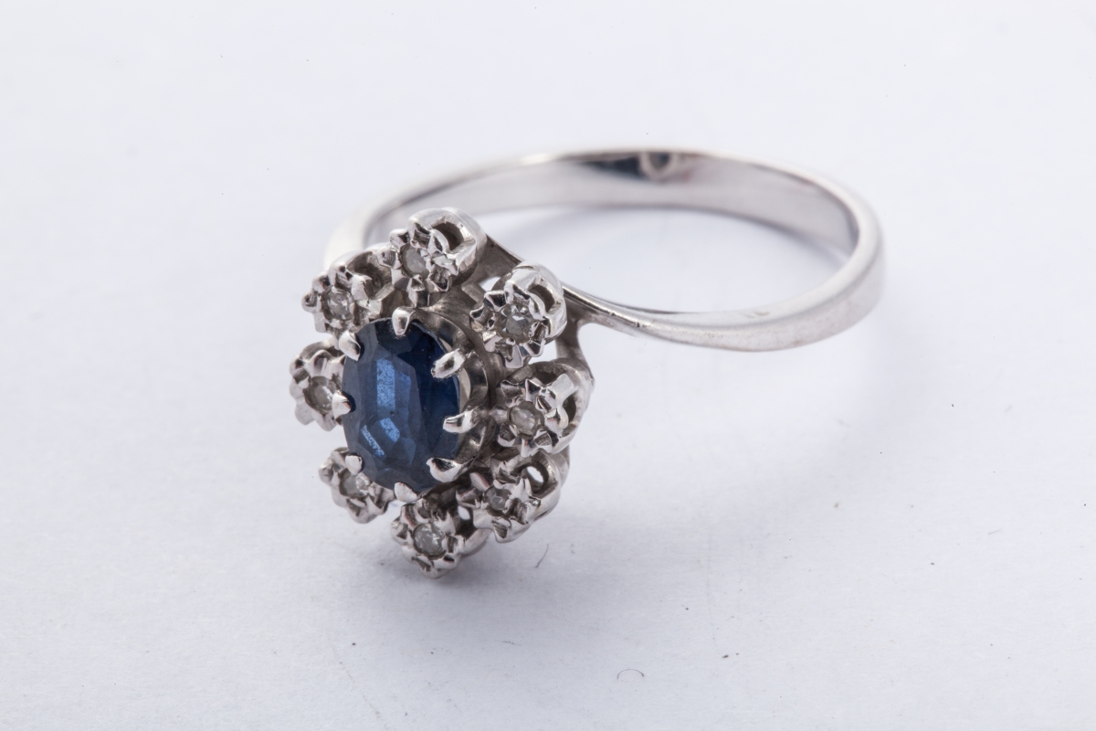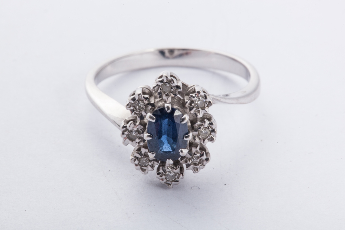 BAGUE MARGUERITE en or gris, centrée d'un saphir sur griffes et encadré de 8 pierres blanches sur griffes.