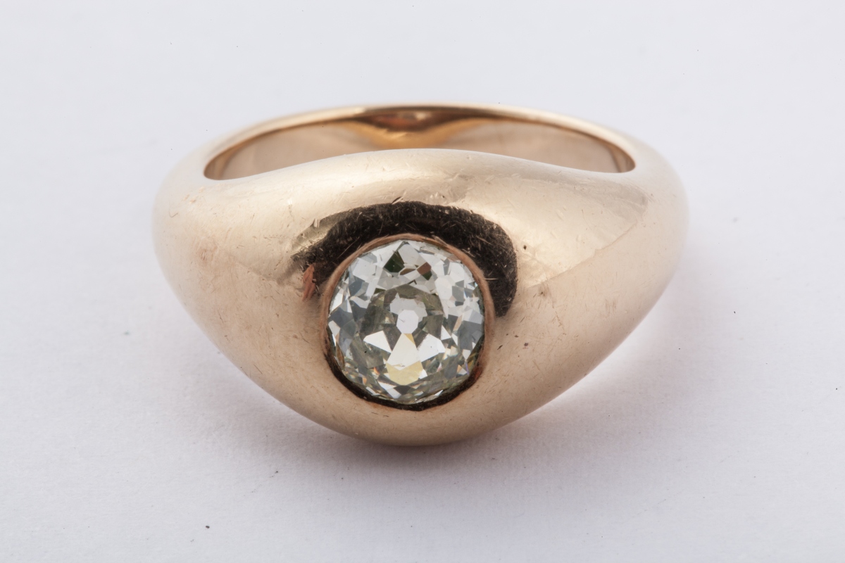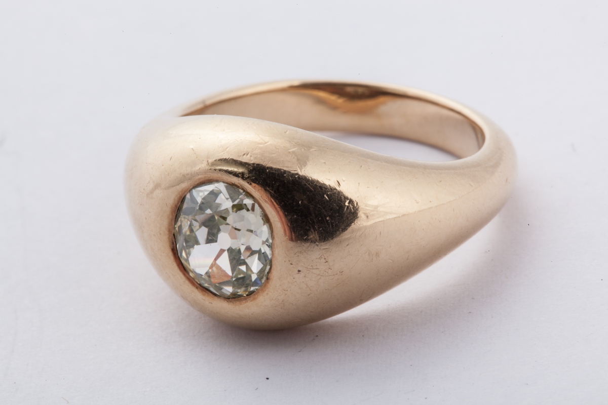 BAGUE jonc en or jaune, ornée en son centre d'un diamant taille ancienne, en serti clos de taille ovale 1,20 carats, couleur M/Z, pureté SI.