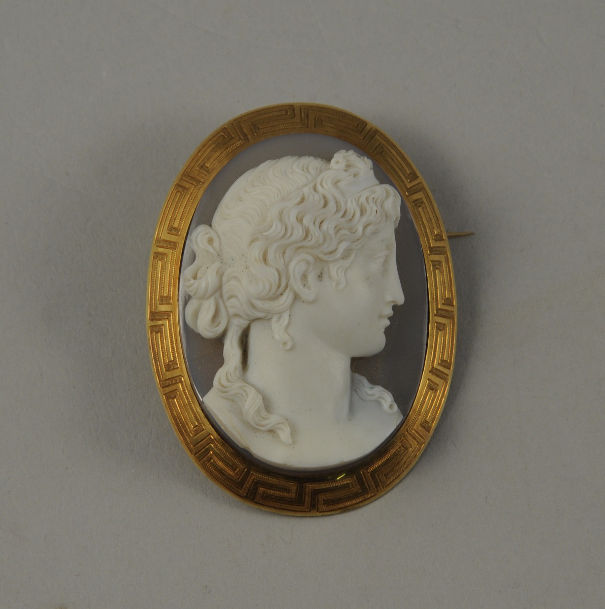 CAMÉE de forme ovale, figurant le profil d'une jeune femme à l'antique. Monture broche en or jaune gravée d'une frise de grecques.