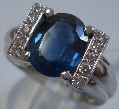 BAGUE JONC godronnée en or blanc, sertie d'un saphir taille ovale de 3,30 carats environ agrémenté de 2 X 5 diamants blancs taille moderne de 0,20 carat.
