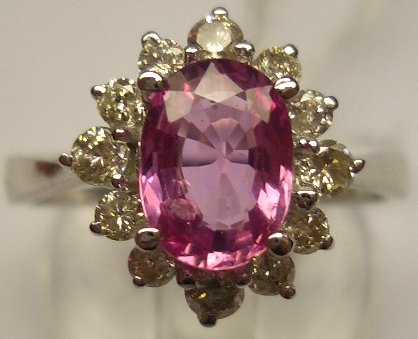 BAGUE MARGUERITE en or blanc, ornée d'un saphir rose taille ovale d'environ 1,30 carats dans un entourage de 12 diamants taille moderne de 0,50 carat.