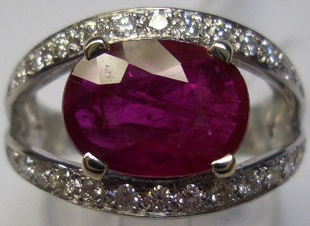 BAGUE corps en V en or blanc, sertie d'un rubis taille ovale de 3,25 carats environ, agrémenté de 34 diamants blancs taille moderne de 0,60 carat.