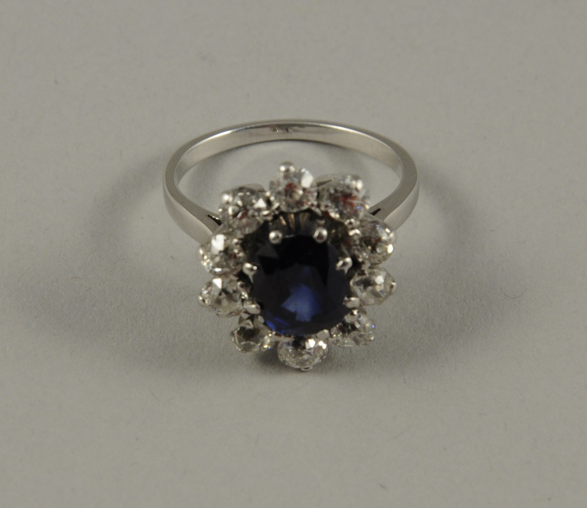 BAGUE MARGUERITE en or blanc sertie en son centre d'un saphir de taille émeraude (environ 9 x 8 mm) dans un entourage dix brillants.