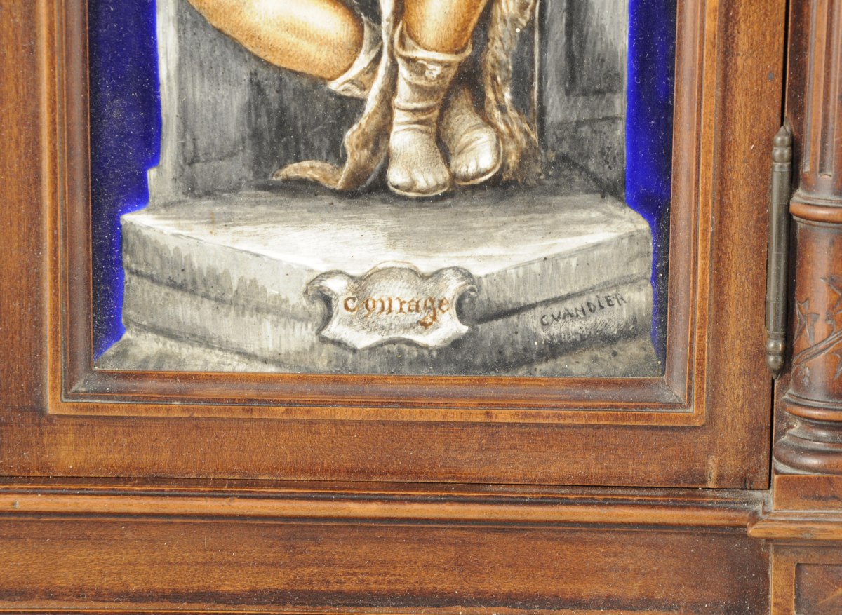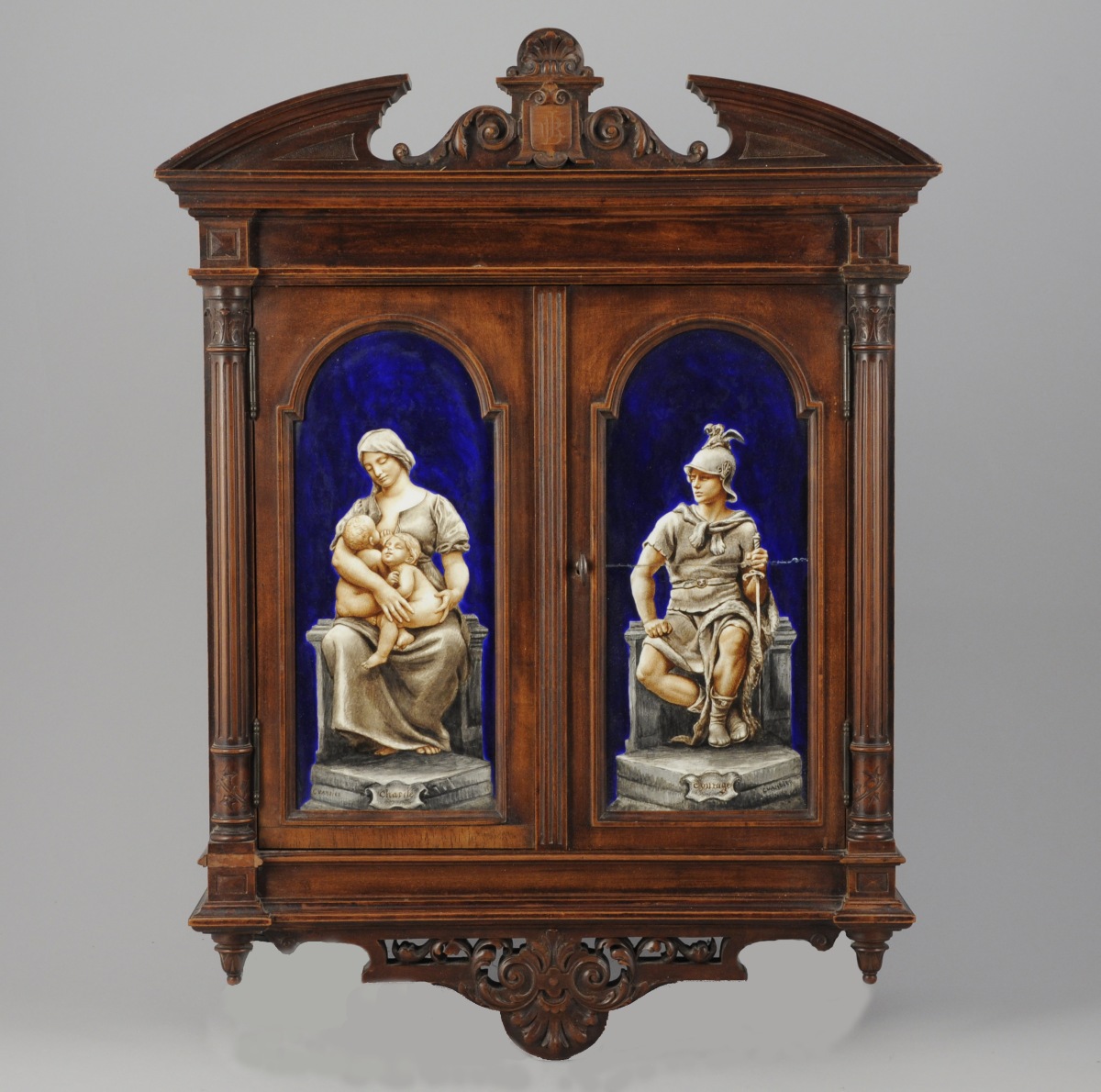 ARMOIRETTE-VITRINE en bois naturel de forme rectangulaire, à demi-colonne, fronton et base architecturés. Initiales JB. Elle ouvre à une double porte ornée de 2 plaques émaillées bleu représenant la "Charité" et le "Courage" en grisaille. Signées C VANDIER.