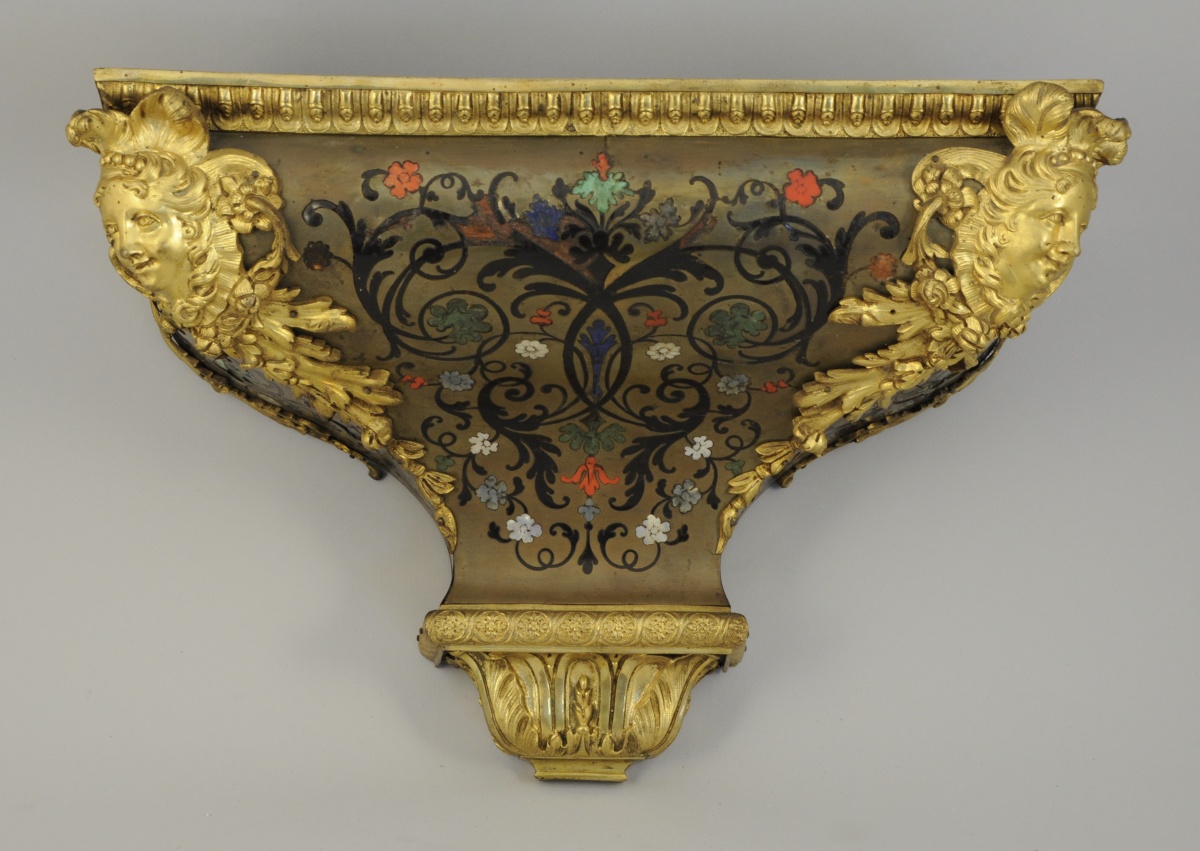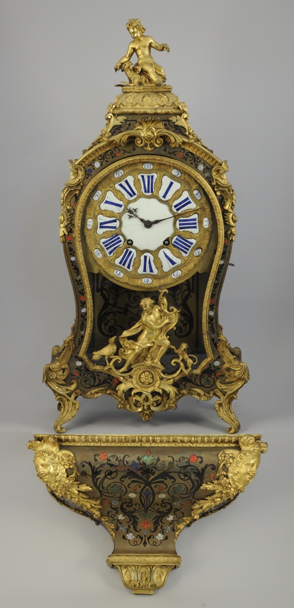 CARTEL et sa CONSOLE d'APPLIQUE en marqueterie dite "Boulle" en contrepartie d'écaille brune et d'incrustations en corne polychromes et nacre sur fond de laiton. Riche ornementation de bronzes ciselés et dorés représentant volutes, acanthes, coquilles, frises rai-de-coeur.