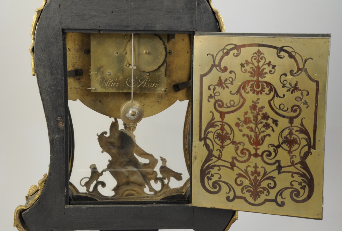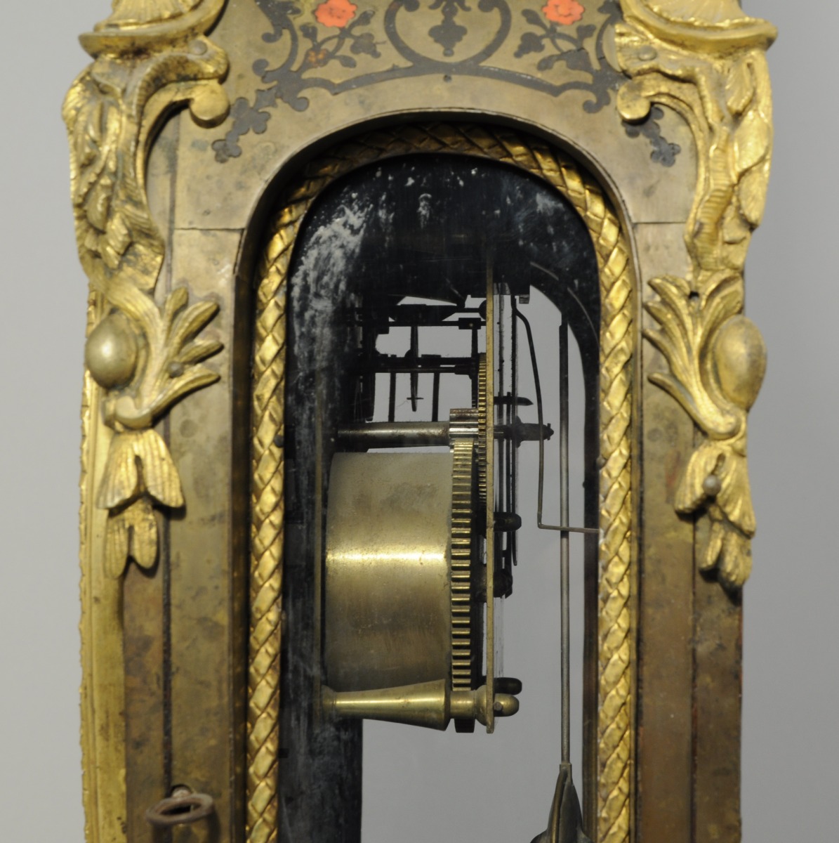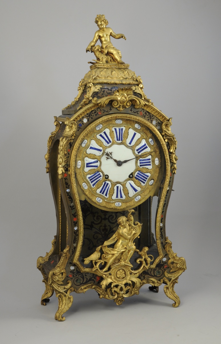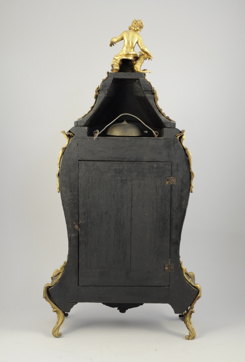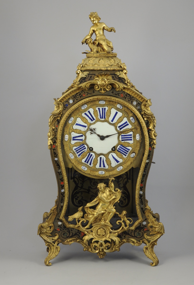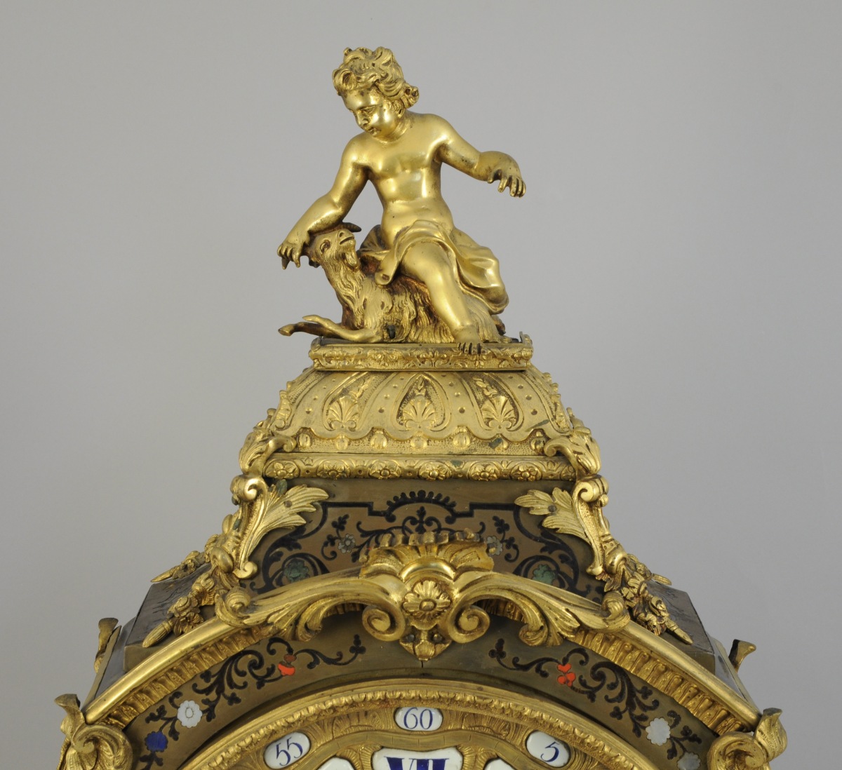 Au-dessus du cadran, un amour de bronze chevauche un bouc. Sous le cadran, Apollon en bronze avec sa lyre est entouré d'un lion et d'un aigle. L'intérieur est décoré dans le fond d'un damier, marqueté en contrepartie d'écaille sur laiton. La console d'applique ornée de bronzes ciselés et dorés représentant des chutes feuillagées aux angles antérieurs et des coquilles.