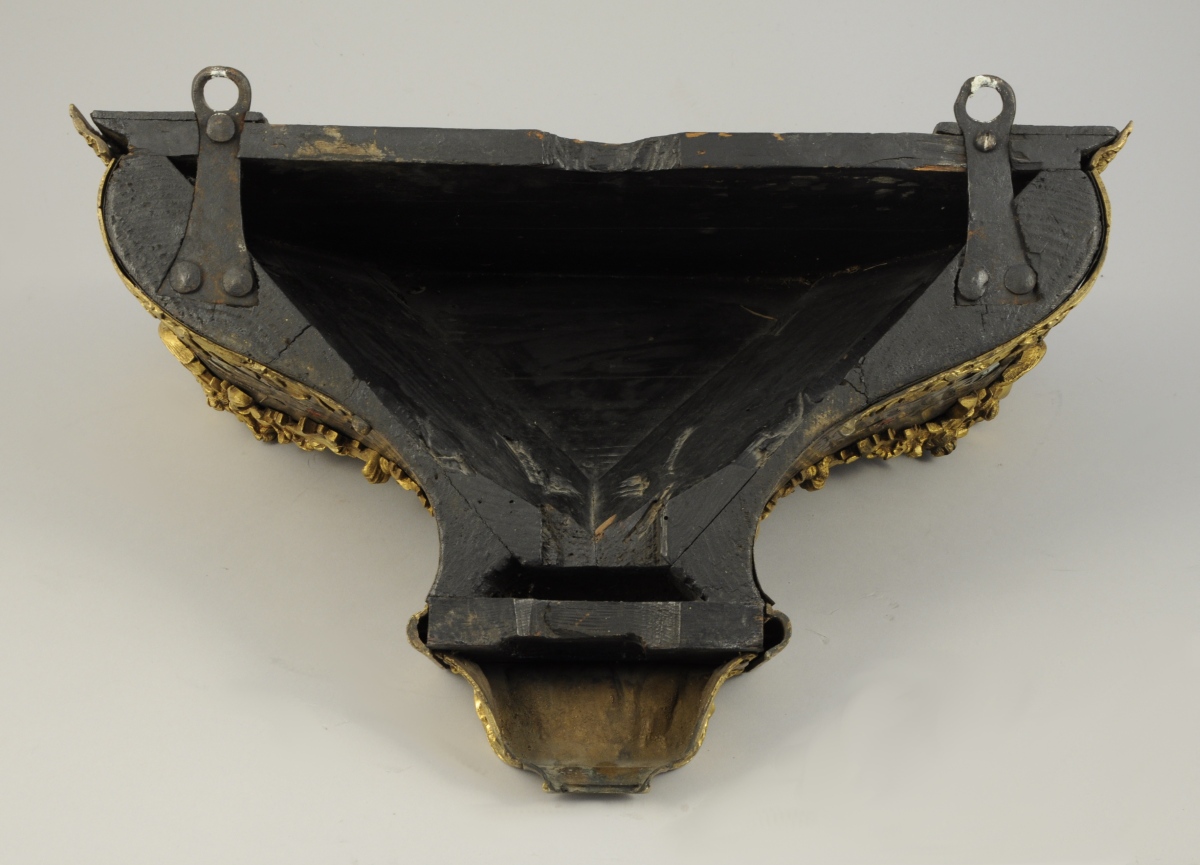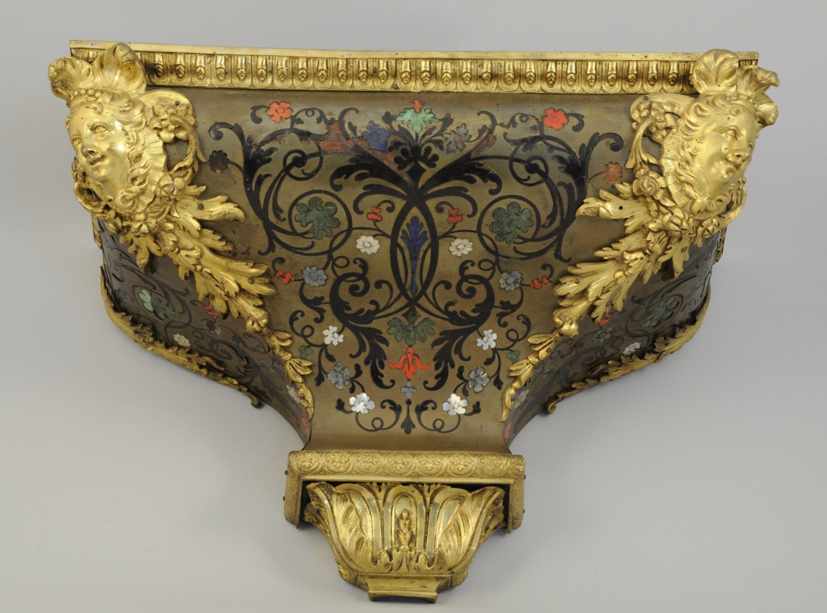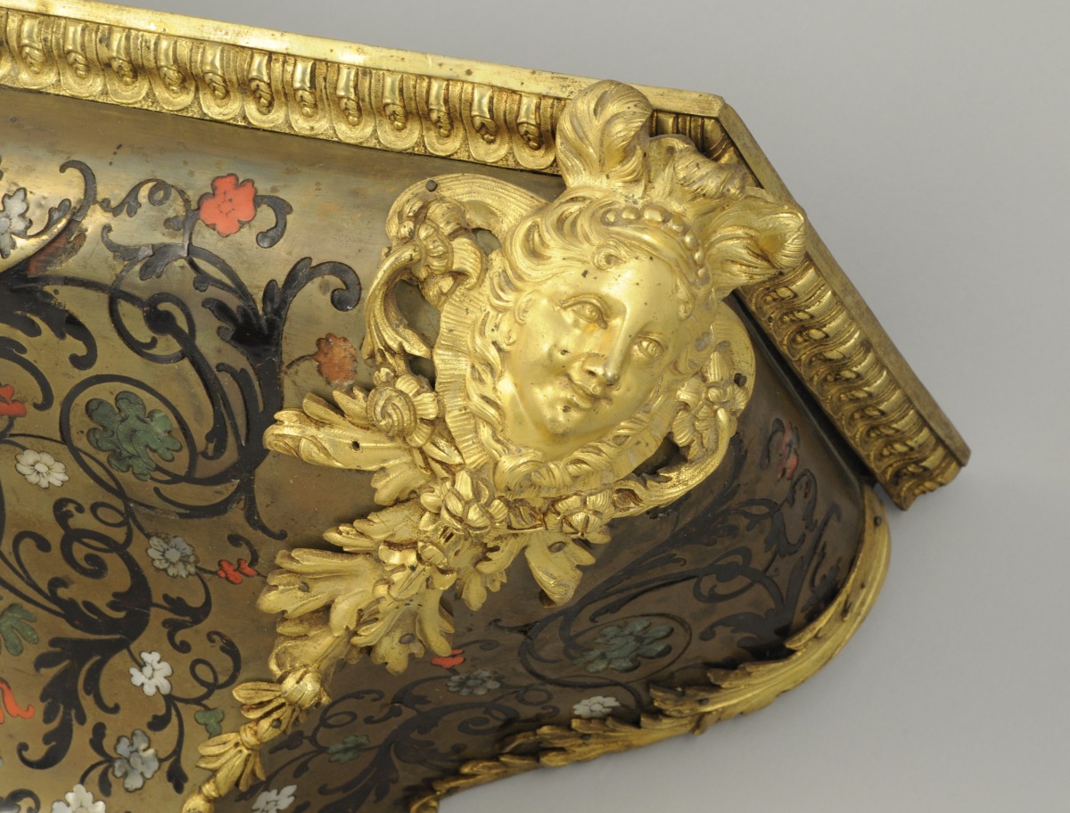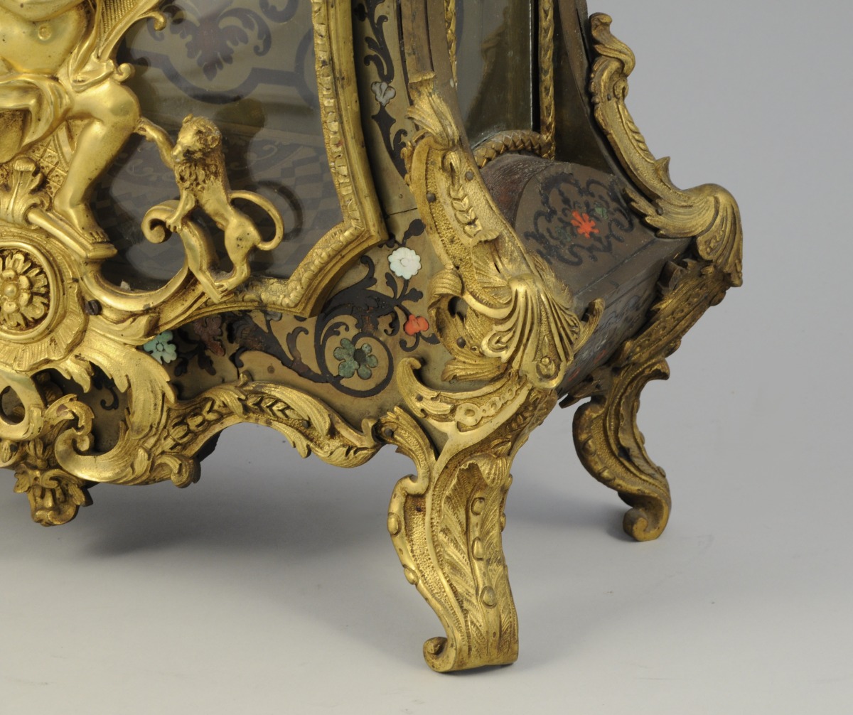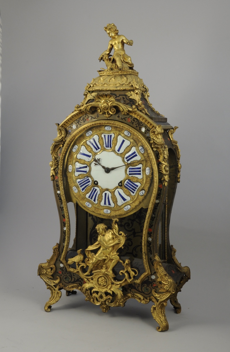 Au-dessus du cadran, un amour de bronze chevauche un bouc. Sous le cadran, Apollon en bronze avec sa lyre est entouré d'un lion et d'un aigle. L'intérieur est décoré dans le fond d'un damier, marqueté en contrepartie d'écaille sur laiton. La console d'applique ornée de bronzes ciselés et dorés représentant des chutes feuillagées aux angles antérieurs et des coquilles.