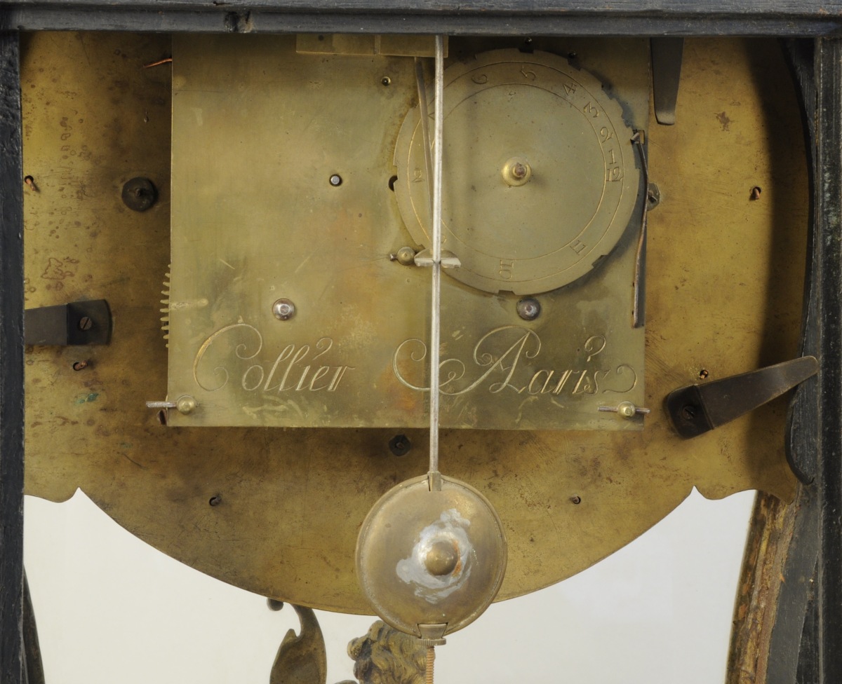 Mouvement signé: "COLLIER A PARIS". La famille COLLIER est active dans la première moitié du XVIIIe siècle à Paris. Jacques, le père, ouvrier libre est installé entre 1721 à 1759 rue de la Vieille Boucherie à Paris. Il présente en avril 1728 à l'Académie des Sciences un ingénieux mécanisme de répétition des demi quarts qui rencontre un grand succès. Son fils, Bernard-Jacques, est reçu maître le 26 juillet 1743.