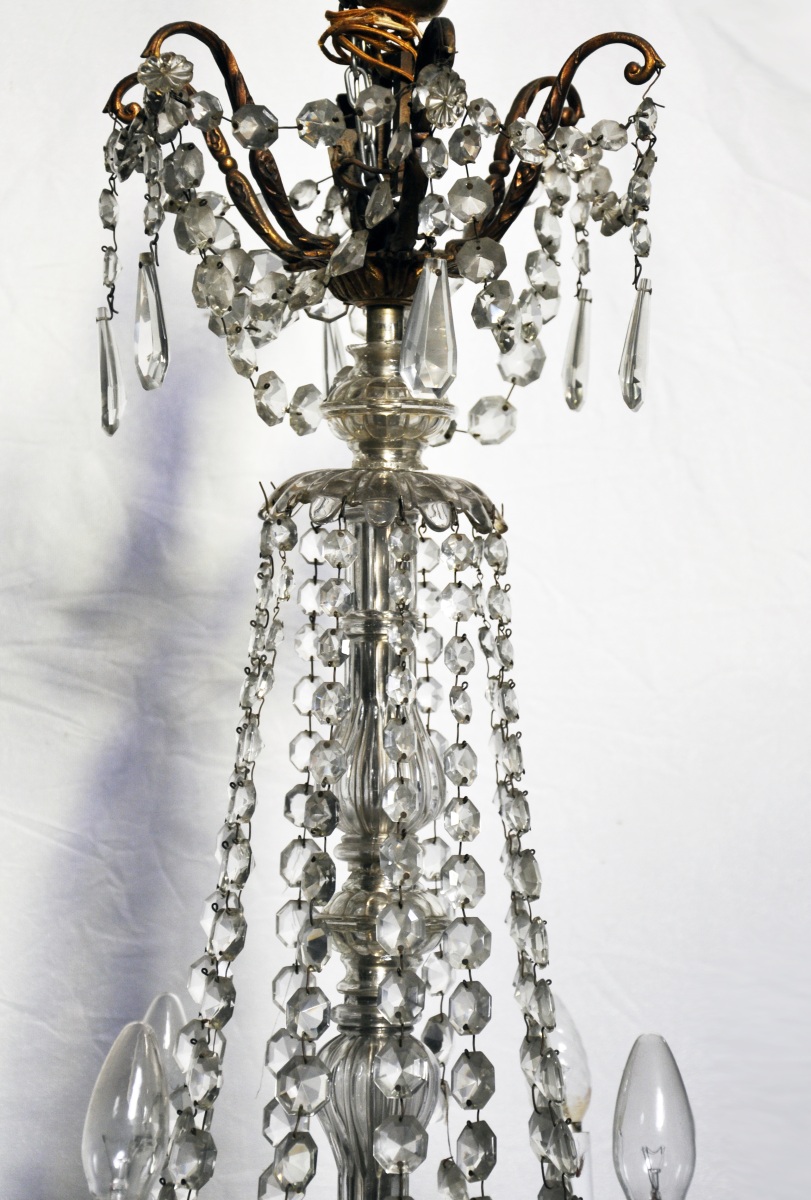 LUSTRE CORBEILLE en bronze, verre et cristal à douze lumières réparties sur deux couronnes et orné de pampilles et guirlandes de verre. Le pilastre central en verre moulé.