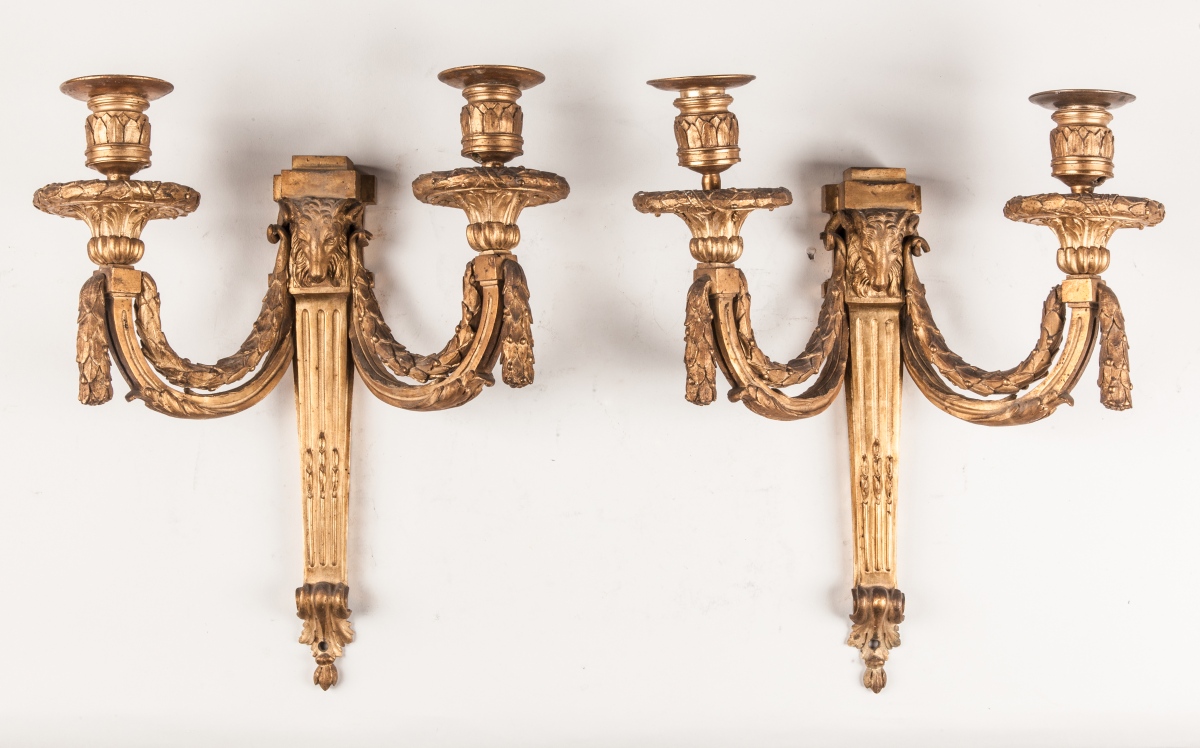 PAIRE D'APPLIQUES en bronze ciselé et doré à deux bras de lumière. Le fût en gaine cannelé et rudenté se termine par une feuille d'acanthe stylisée. Il est orné d'une tête de bélier et d'un entablement à l'amortissement. Les bras de lumière sont agrémentés d'une guirlande de laurier. Les binets reçoivent un décor de feuilles d'eau. Les bobèches de guirlandes de laurier rubanées et feuilles d'acanthe.