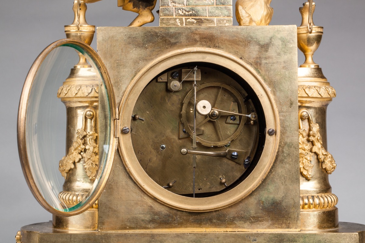 PENDULE À LA PARQUE en bronze ciselé et doré figurant une Parque filant assise sur une fontaine au masque de faune et accompagnée d'un chien. Le cadran s'inscrit dans une caisse rectangulaire, il est souligné d'un entourage octogonal orné d'une frise de feuilles d'acanthe et de quatre coquilles en écoinçons. Sur les côtés, deux demi-colonnes ornées de godrons, guirlandes feuillagées et feuilles d'acanthe. Elles sont sommées de deux aiguières. La base rectangulaire à côtés cintrés et ressaut central