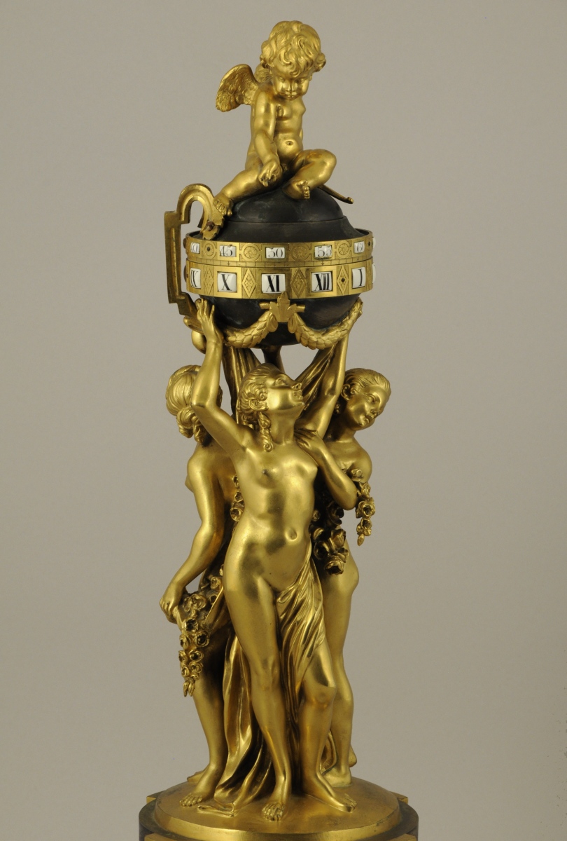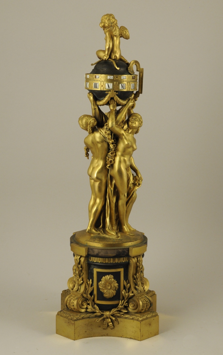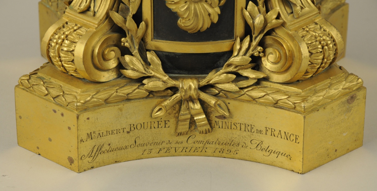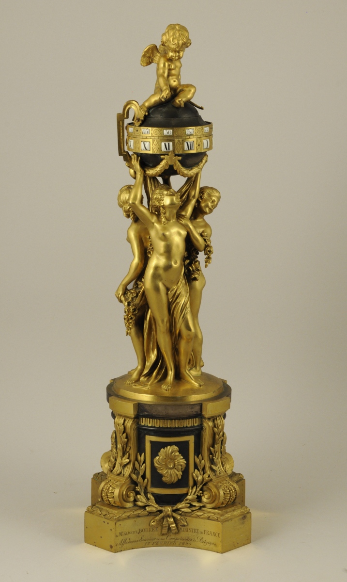 PENDULE AUX TROIS GRÂCES en bronze doré et pâtiné. La base en forme de colonne circulaire ornée de feuillages et d'enroulements. Les trois grâces d'après Clodion, en pied, portant un globe avec une pendule à mouvement horizontal surmonté d'un amour. Envoi gravé sur la base: " A Mr Albert Bourée, Ministre de France / Affectueux souvenir de vos Concitoyens en Belgique / 13 février 1895".