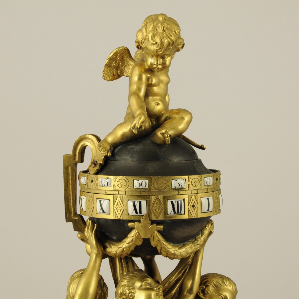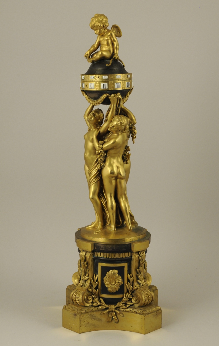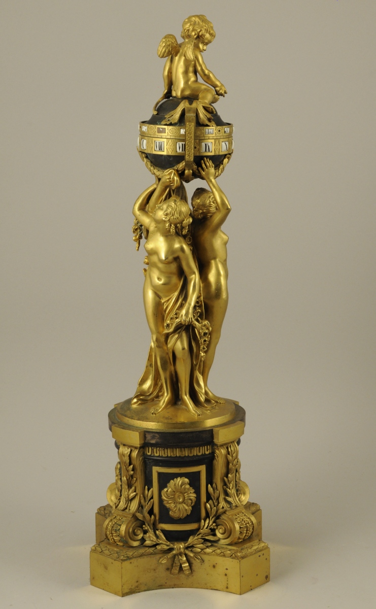 PENDULE AUX TROIS GRÂCES en bronze doré et pâtiné. La base en forme de colonne circulaire ornée de feuillages et d'enroulements. Les trois grâces d'après Clodion, en pied, portant un globe avec une pendule à mouvement horizontal surmonté d'un amour. Envoi gravé sur la base: " A Mr Albert Bourée, Ministre de France / Affectueux souvenir de vos Concitoyens en Belgique / 13 février 1895".