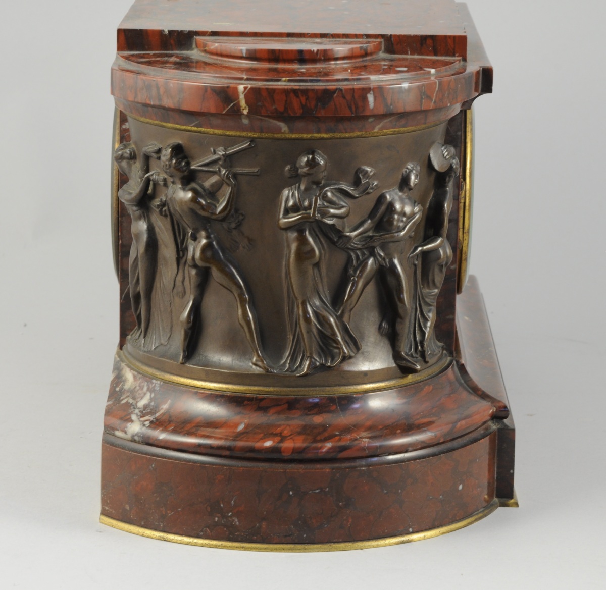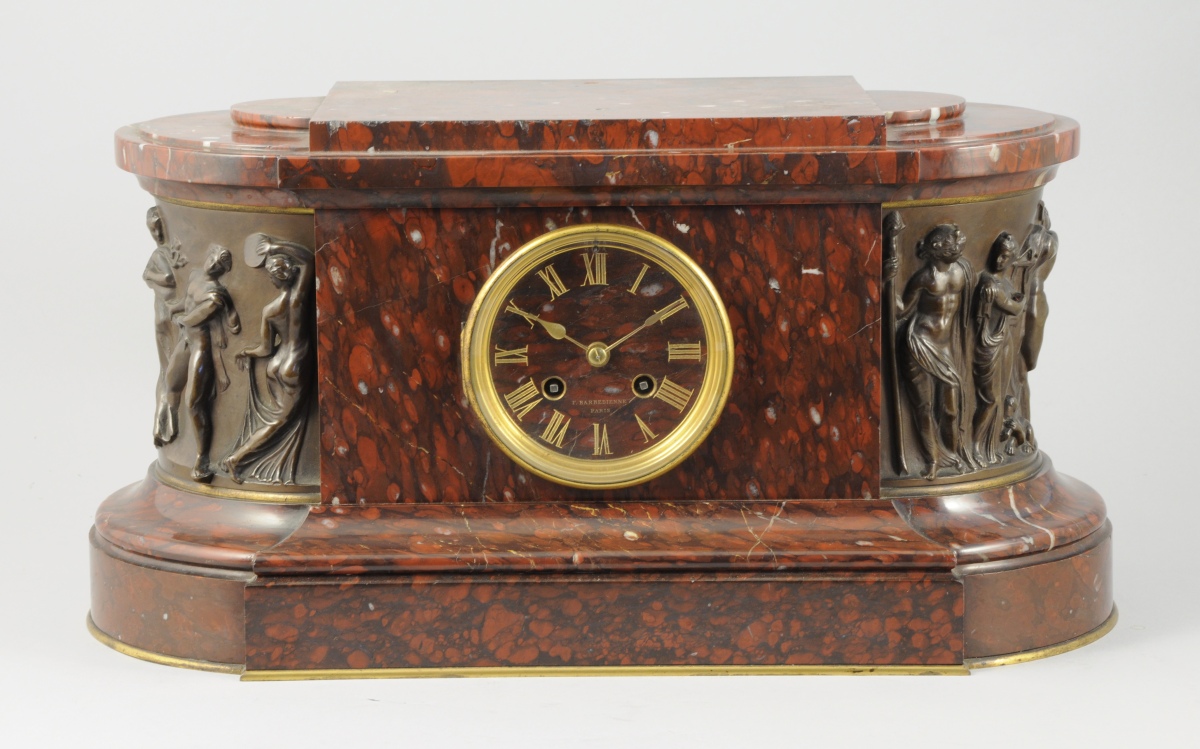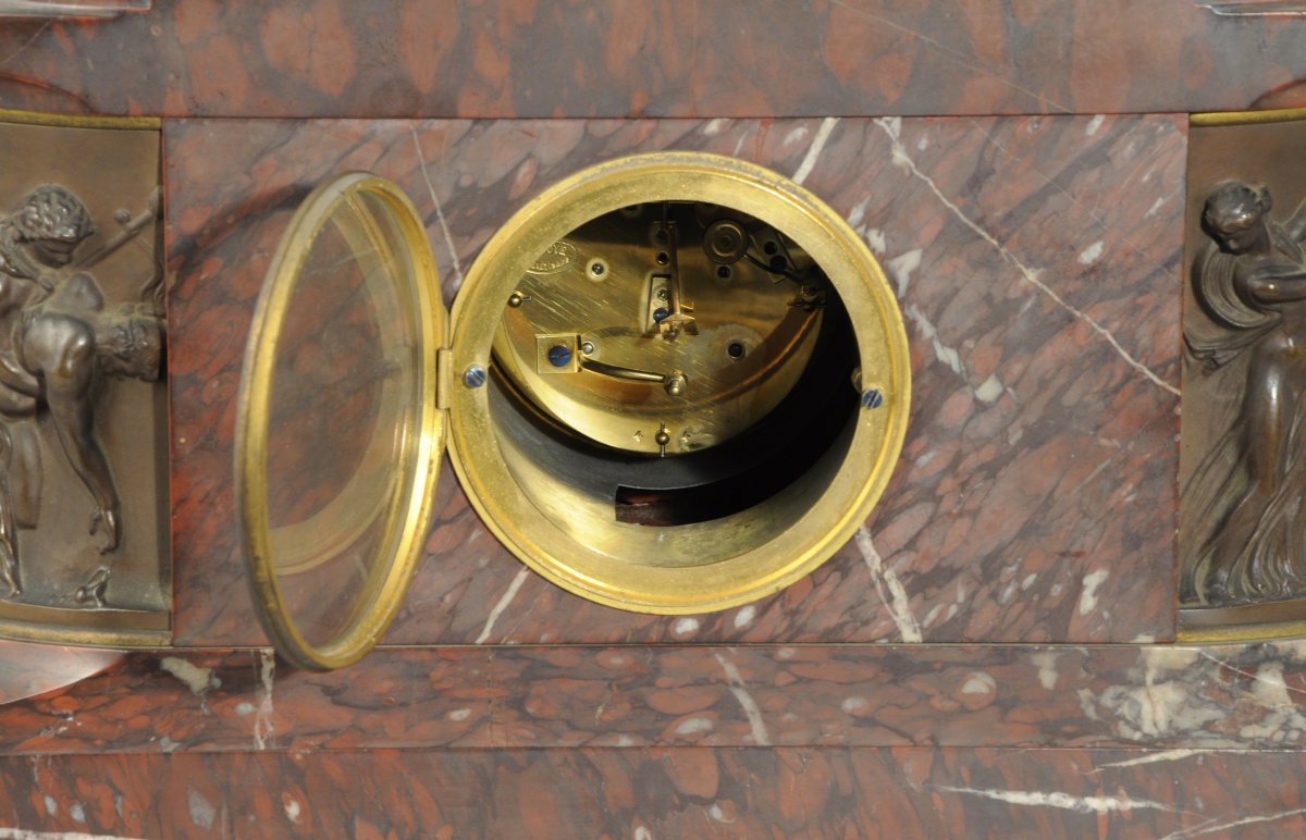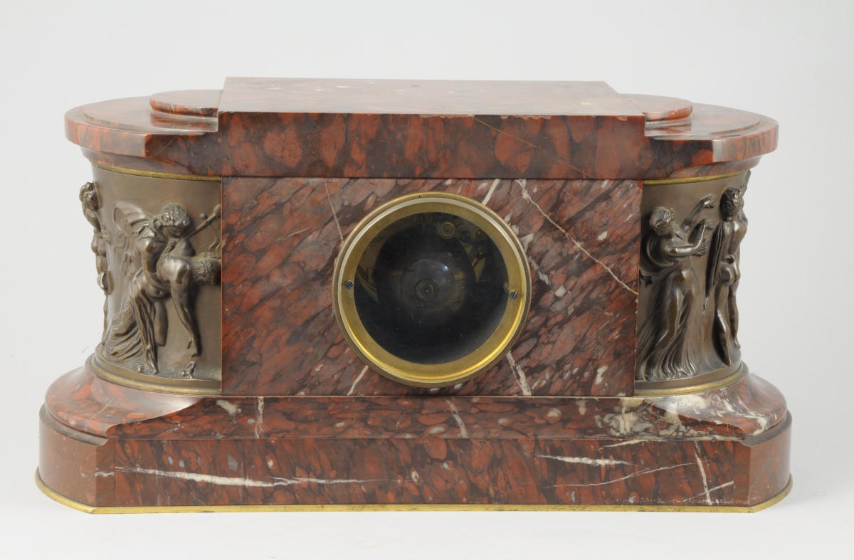 PENDULE en marbre griotte de forme ovale. Cadran à chiffres romains en son centre. Encadré aux extrémités par deux bas-relief en bronze patiné figurant une ronde de personnages antiques.