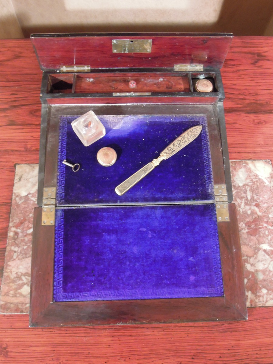 ÉCRITOIRE en palissandre, placage d'ébène et marqueterie de laiton ornée d'une couronne de Marquis ouvrant à deux abattants, la serrure marquée TAHAN À PARIS, avec ses deux godets en verre et leur couvercle de cuivre.