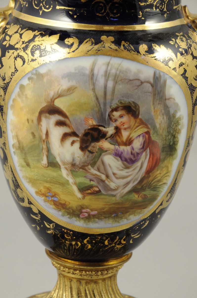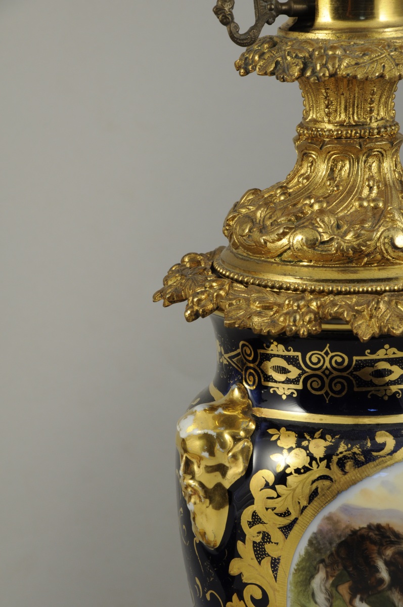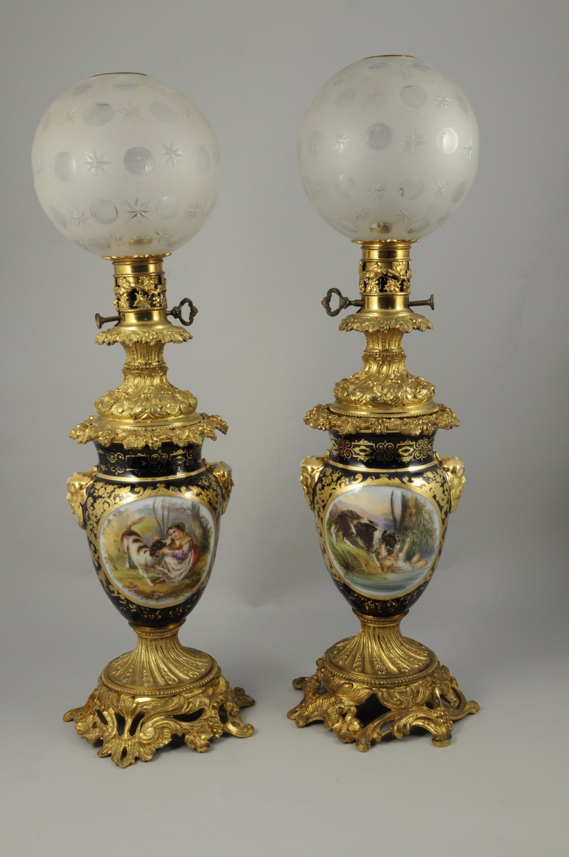 PAIRE DE LAMPES à PÉTROLE en bronze doré, porcelaine et verres. En forme de vase monté. Porcelaine à médaillon représentant des scènes bucoliques de jeunes filles et de chiens. Fond bleu royal à dorure de guirlandes de fleurs et feuilles d'acanthe stylisées. Encadré de têtes de satyres dorés en demi relief. Ornementation de bronzes tels que: feuilles d'acanthe ajourées, rais de perles et canaux torsadés à la base. Guirlande feuillagée, canaux rudentés et torsadés, fruits et fleurs supportant le porte-mèche ajouré. Verres boules givré à motifs de besants et étoiles taillées.