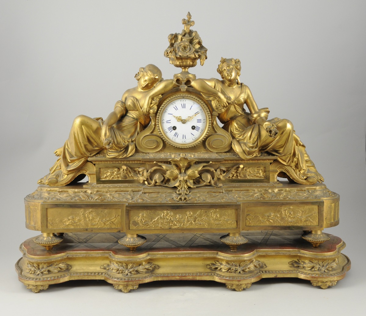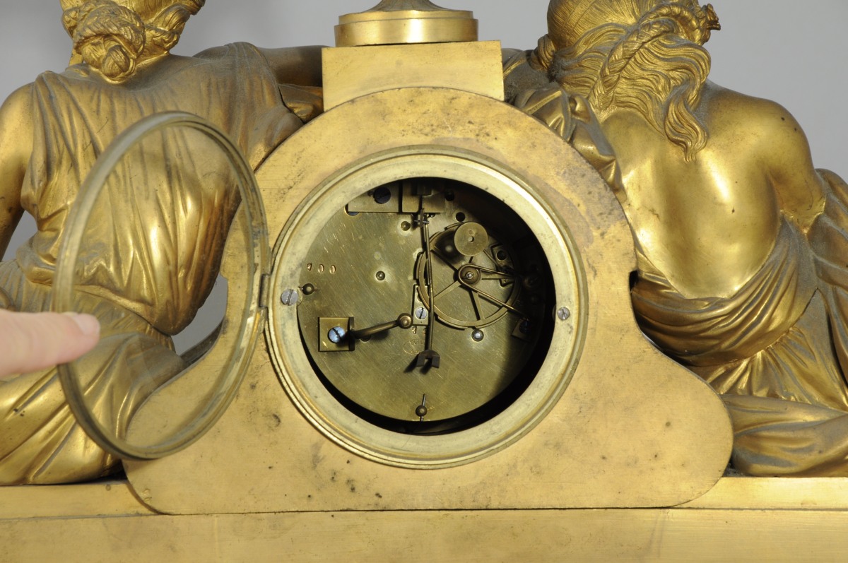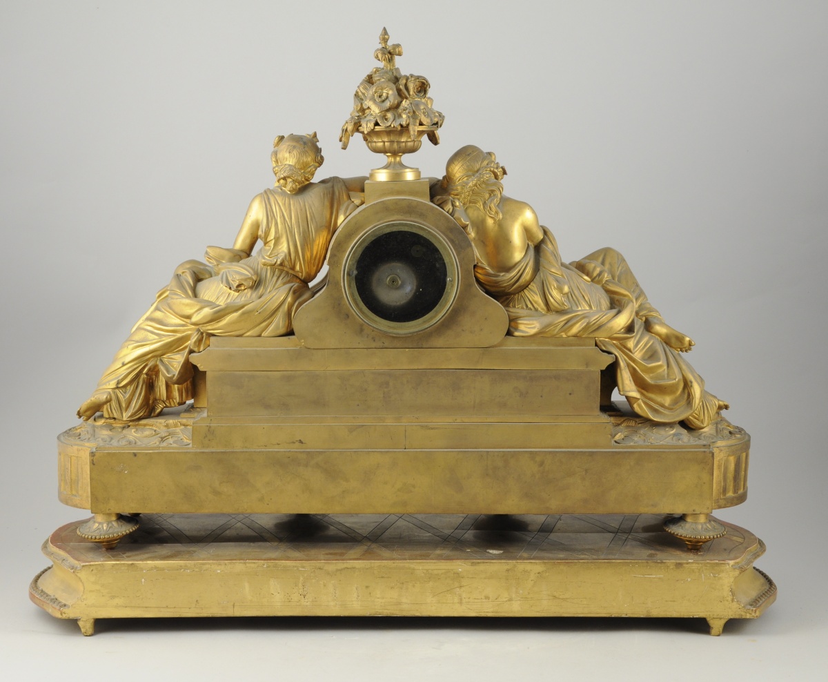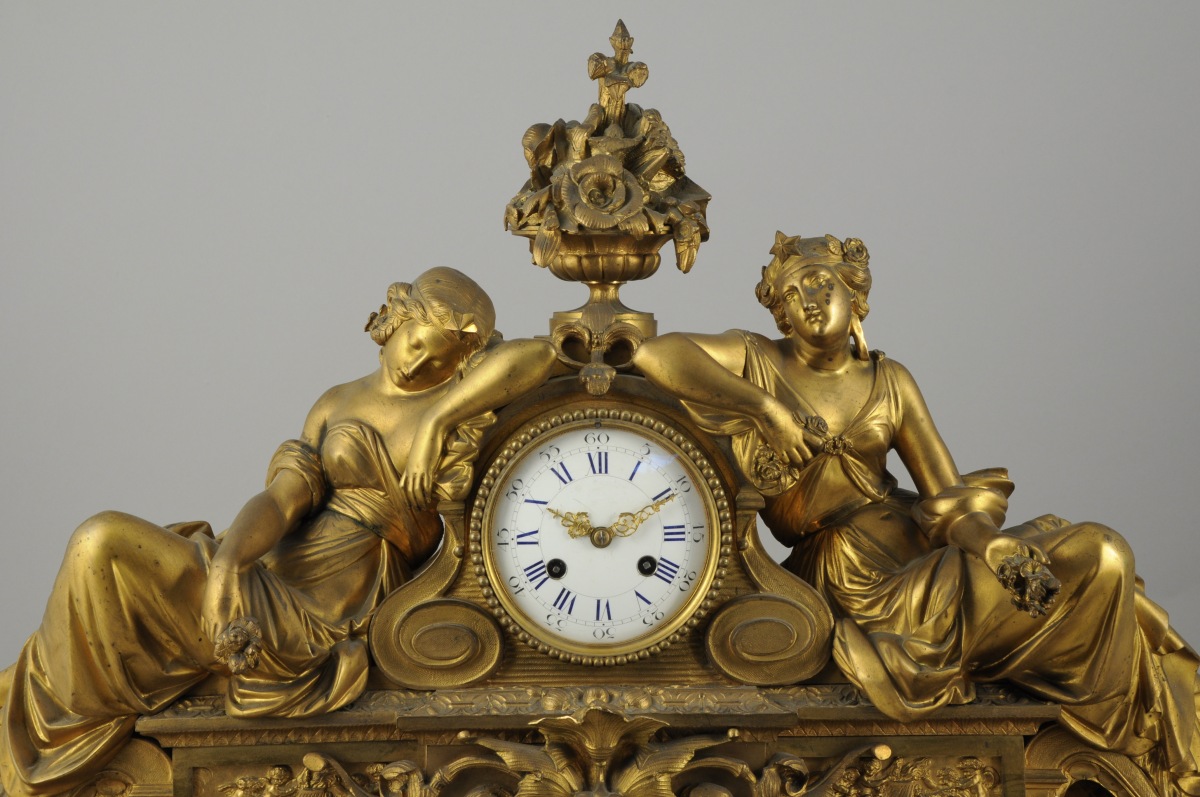 PENDULE en bronze et bois dorés. Deux allégories du jour et de la nuit de part et d'autre d'un cadran émaillé à chiffres romains surmonté d'une corbeille de fleurs. Base ornée d'une fleur stylisée, arabesques et cinq frises d'angelots surmontant six patins de forme toupie.