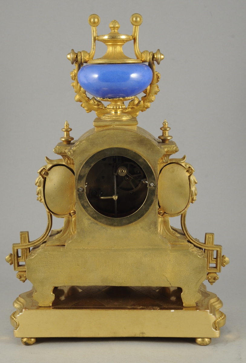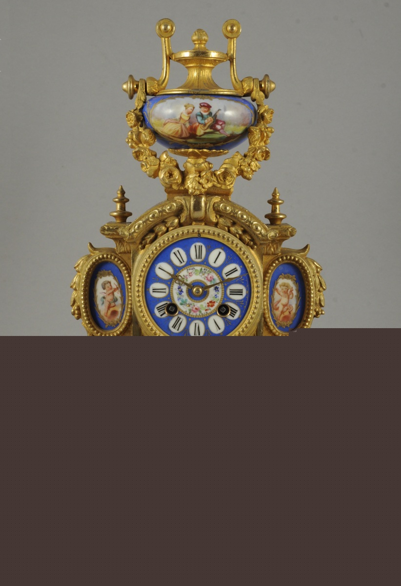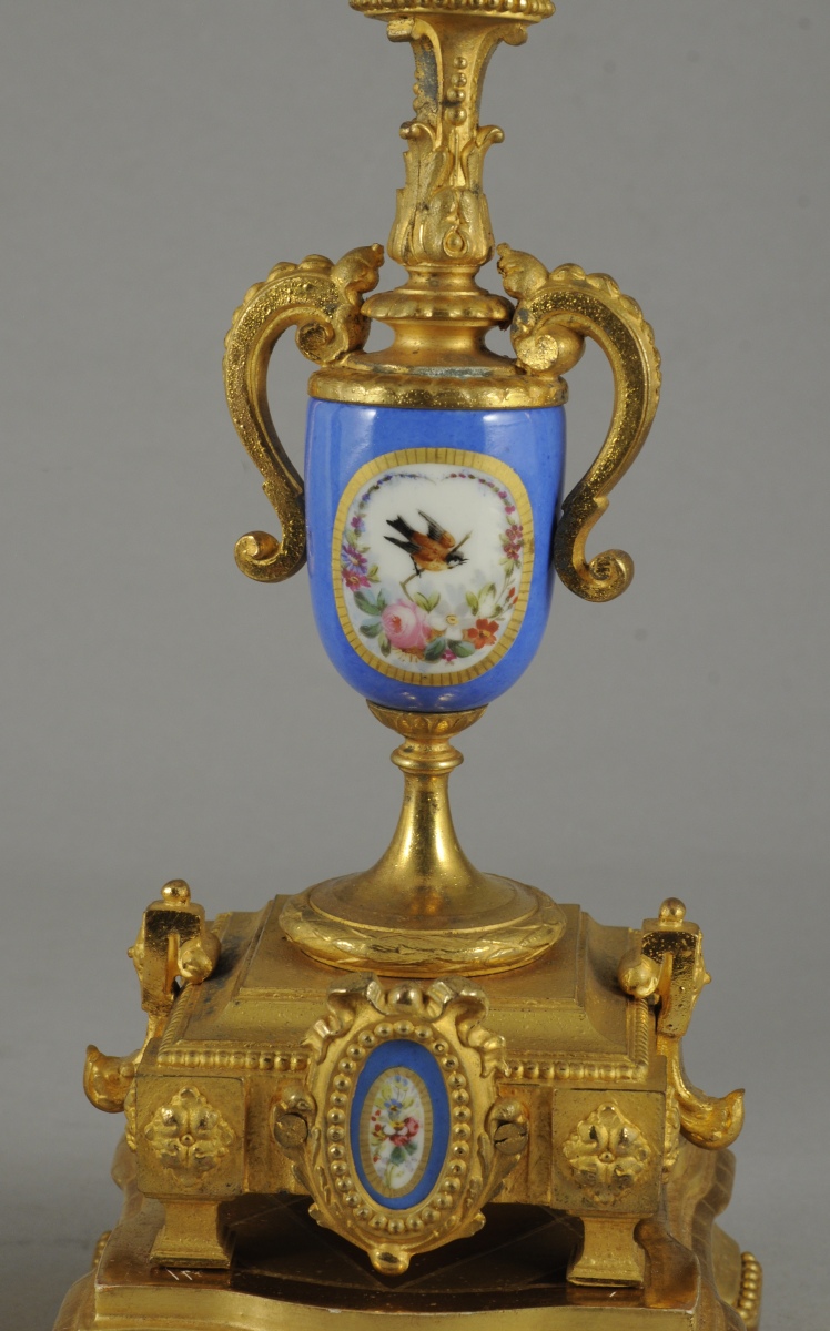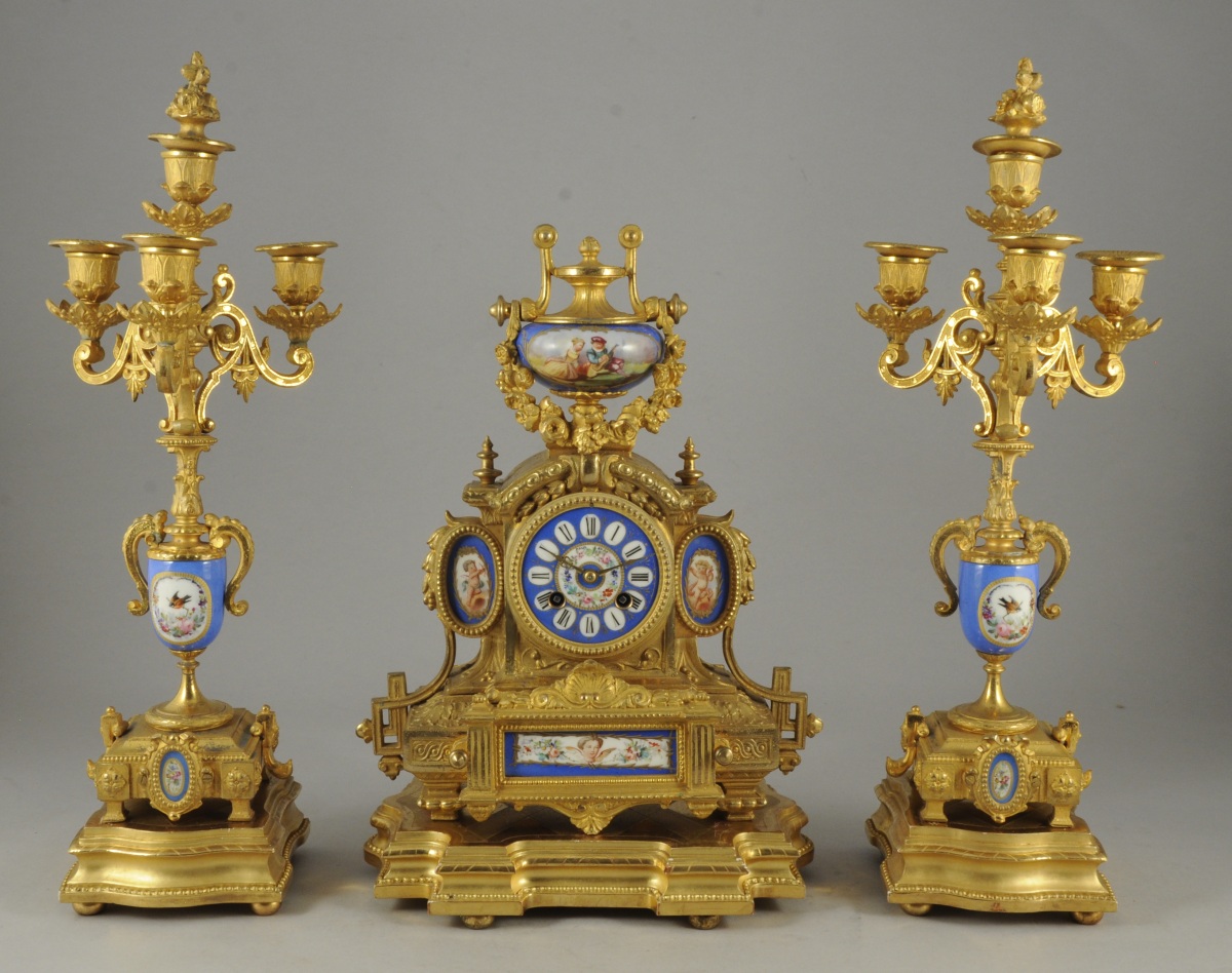 GARNITURE DE CHEMINÉE en régule doré composée d'une pendule et d'une paire de candélabres. La pendule de forme architecturée reçevant un riche décor de raies de perles, feuilles d'acanthe, volutes feuillagées, coquilles stylisées et guirlande fleurie, elle est sommée d'une urne. Les candélabres à quatre lumières en régule doré. Ornementation de plaques de porcelaine à décor de putti, scène galante, oiseaux et fleurs. Cadran en porcelaine indiquant les heures en chiffres romains signé "Paul Lava à St Denis". Socles en bois doré et globes.