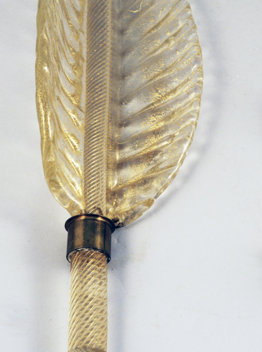PAIRE D'APPLIQUES en verre soufflé (Murano?) à rehauts dorés en forme de plume. Support en bronze doré cannelé.