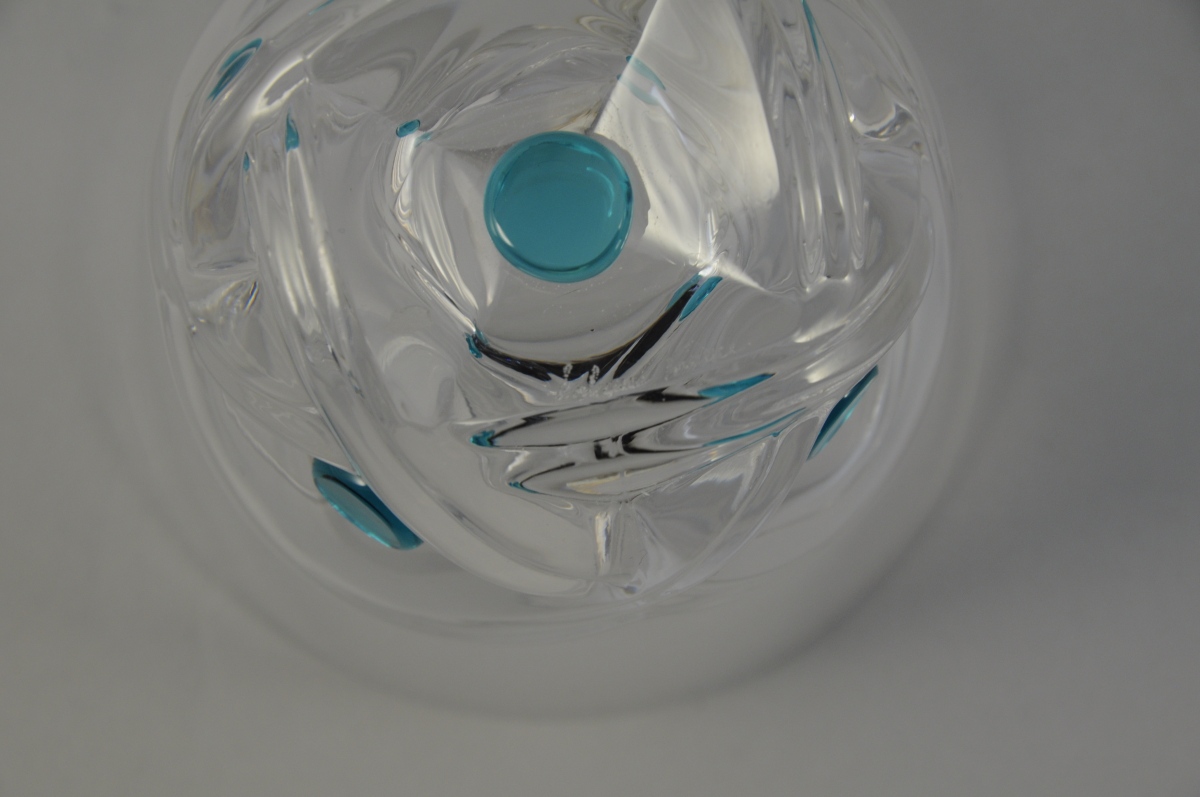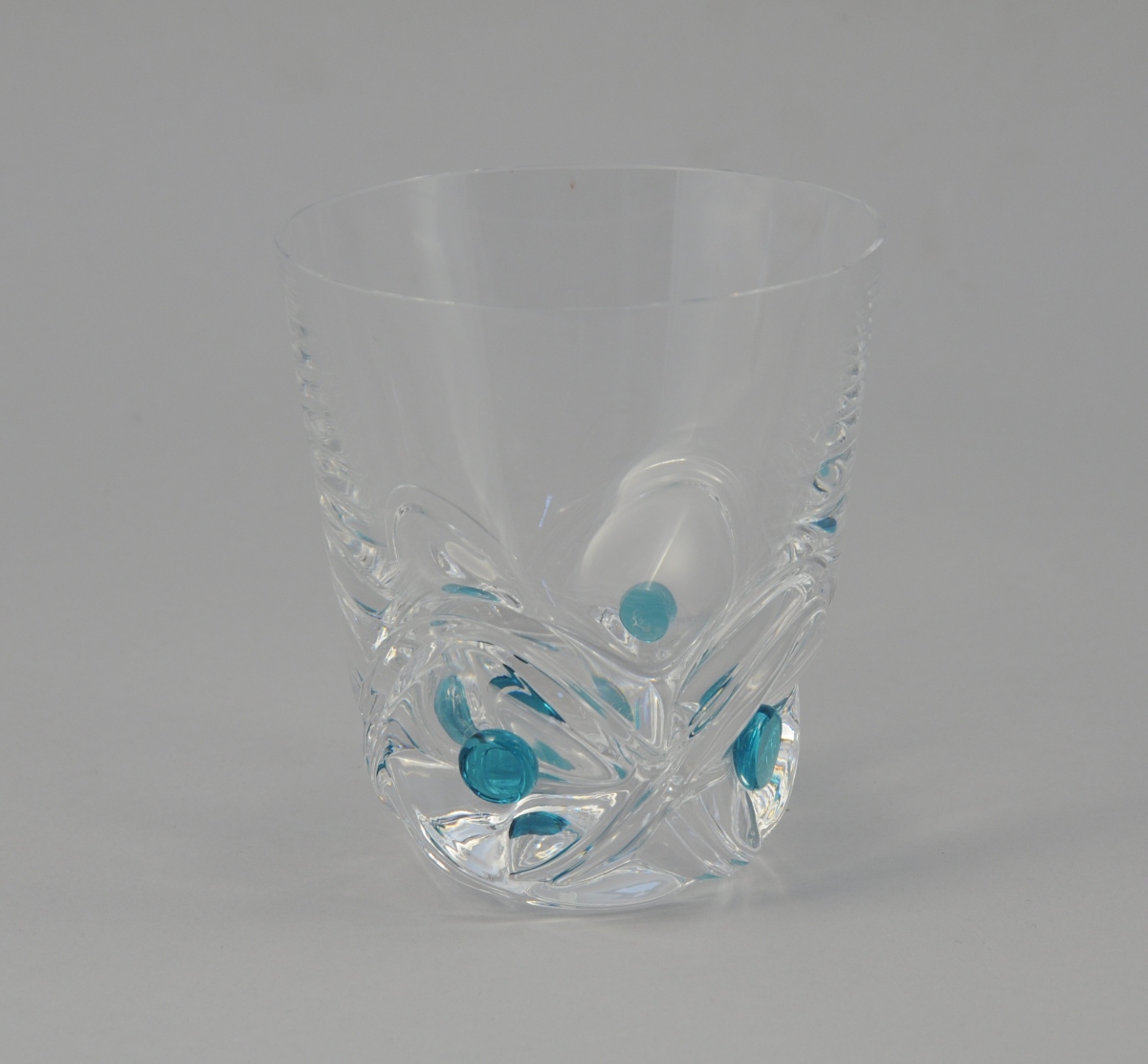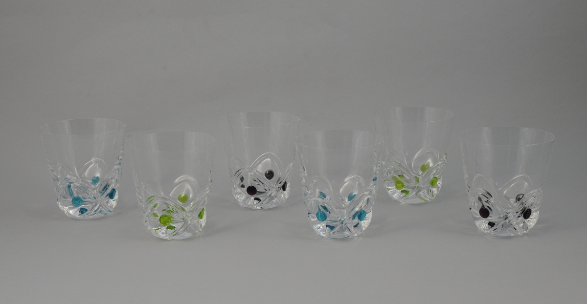 LALIQUE. 6 VERRES À WHISKY en cristal, ornés de 5 cabochons de couleurs vert, bleu et noir.