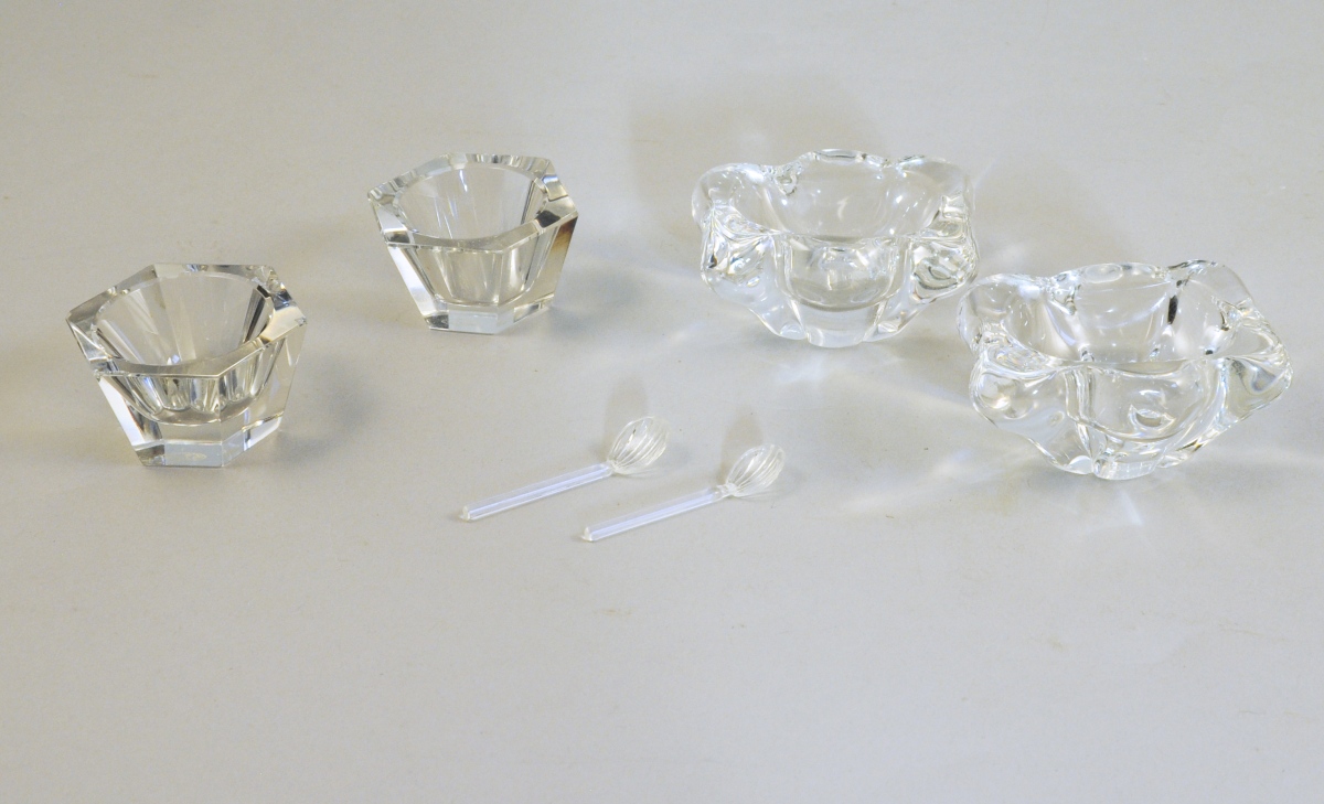 2 paires de SALIÈRES en cristal taillé. Une à pans coupés par BACCARAT. L'autre à bordure chantournée et cuillères en cristal.