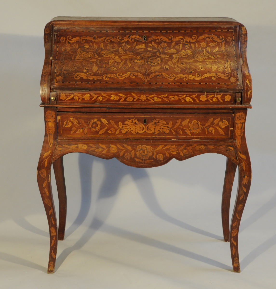L'extérieur de l'abattant figure un bouquet aux oiseaux dans un filet en placage. L'abattant s'ouvre sur deux séries de trois tiroirs, deux casiers tapissés de tissu à motifs floraux sur fond vert et quatre secrets, tels que trappe, porte, et deux casiers dans des pilastres. Le plateau est également marqueté d'un bouquet dans un filet de placage. La ceinture ouvrant à un tiroir et les traverses mouvementées reposent sur quatre pieds galbés.