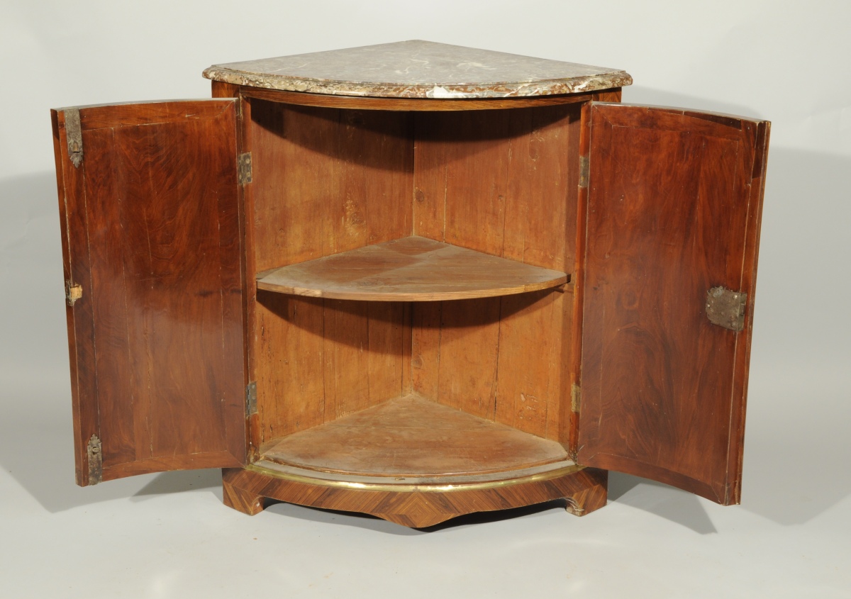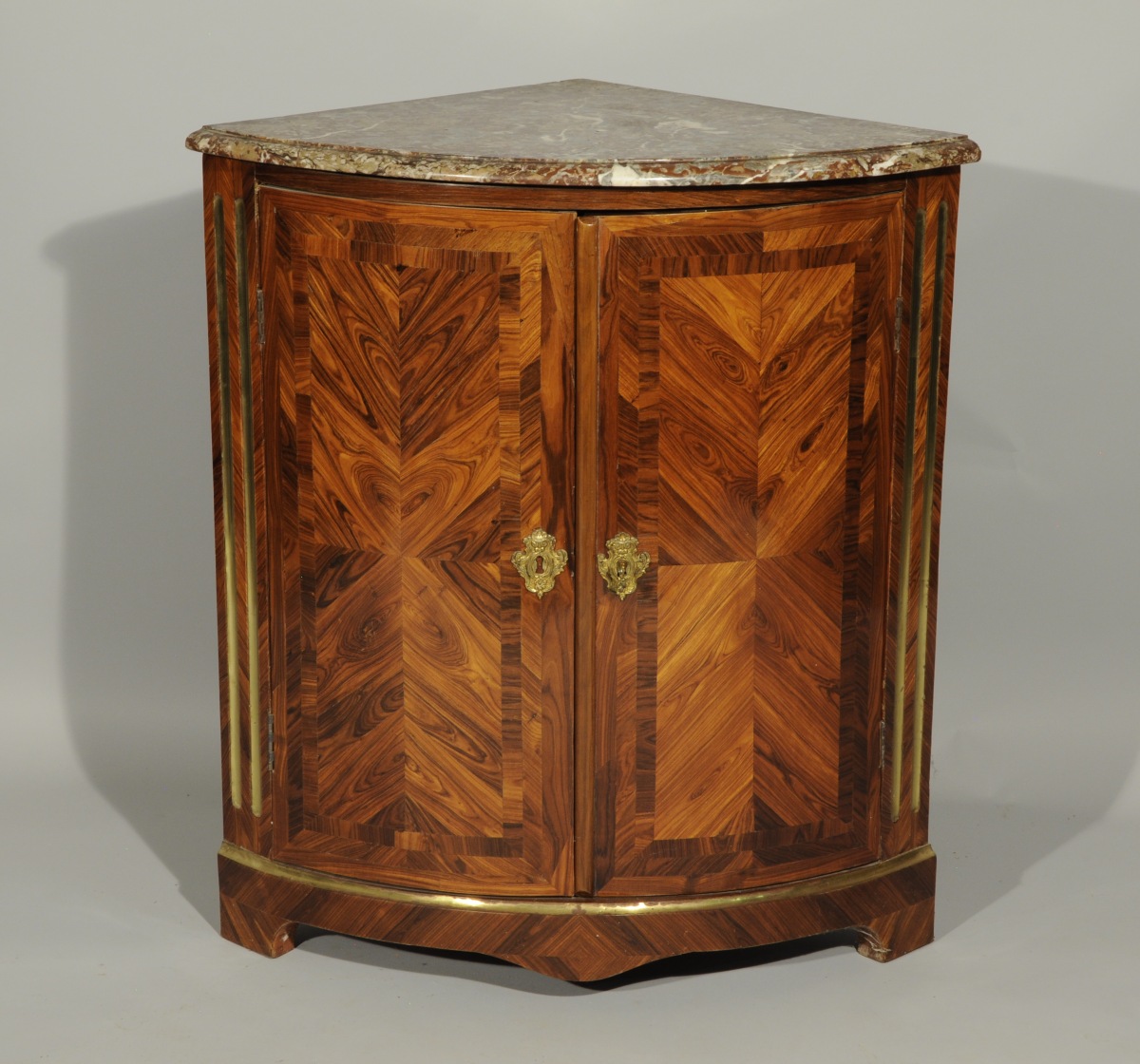ENCOIGNURE en placage de palissandre à frisage en chevron et en X. Les montants droits ornés de deux cannelures. Ouvrant en façade à deux vantaux. Entrées de serrure en bronze doré. Sommé d'un marbre brocatelle.