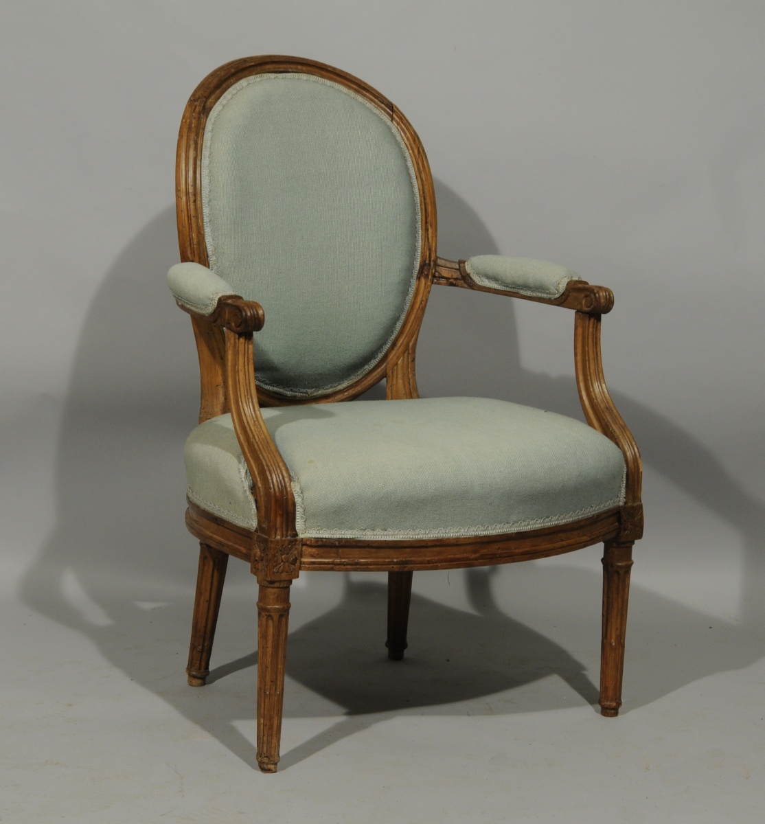 Joint: FAUTEUIL en noyer mouluré et sculpté. Dossier médaillon. Pieds fuselés cannelés rudentés. Louis XVI. XVIIIè. Haut. 86, Larg. 56, Prof. 48 cm. (accidents, restaurations).