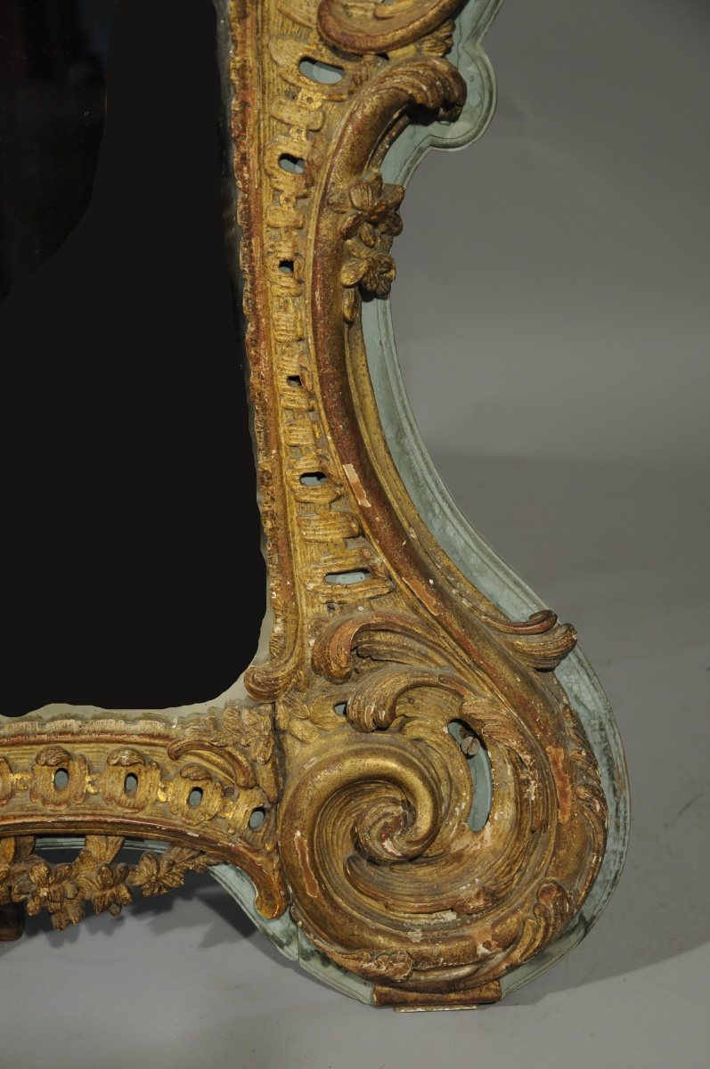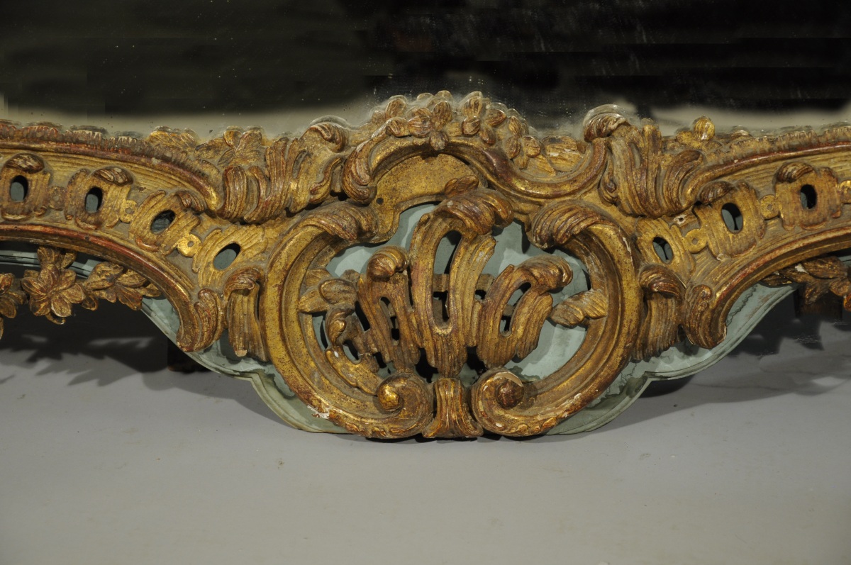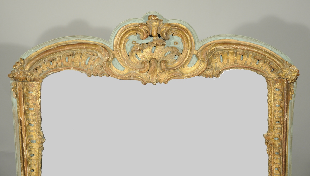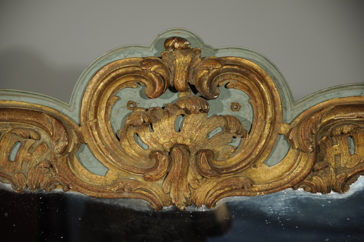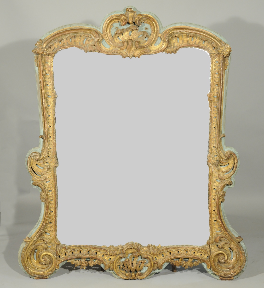 Important MIROIR en bois sculpté, stuqué et doré. À l'entablement médaillon ajouré à coquille stylisée. Montants dorés et ajourés à entrelacs de feuilles d'acanthe stylisées, agrafes et fleurettes. Coins inférieurs à enroulements. Sur une âme en bois rechampi vert d'eau.