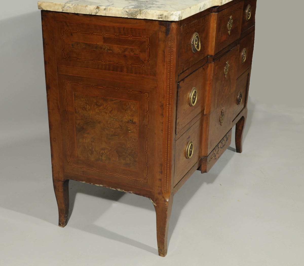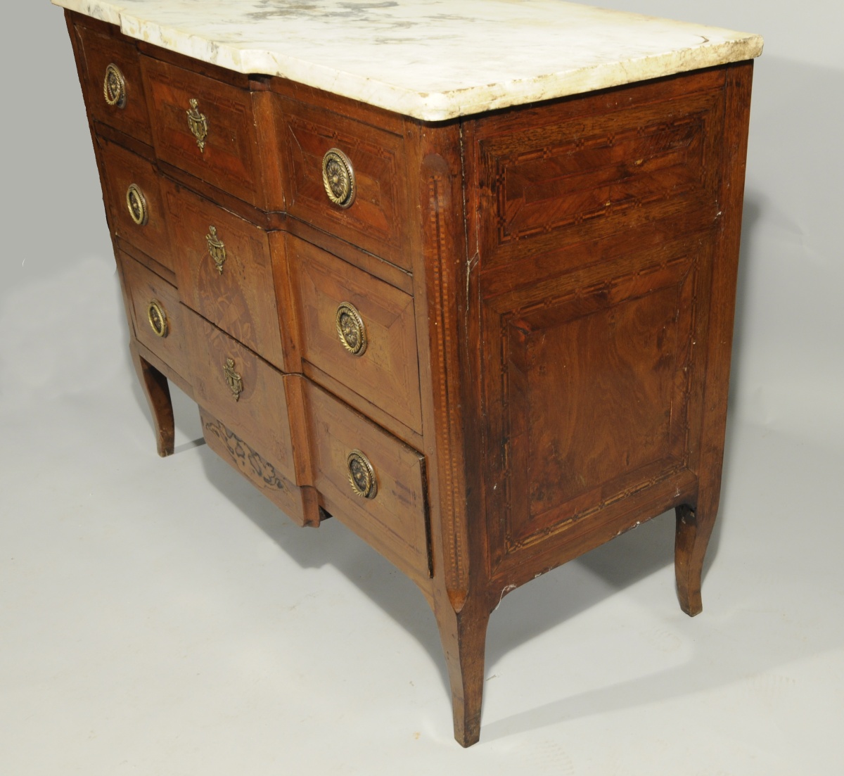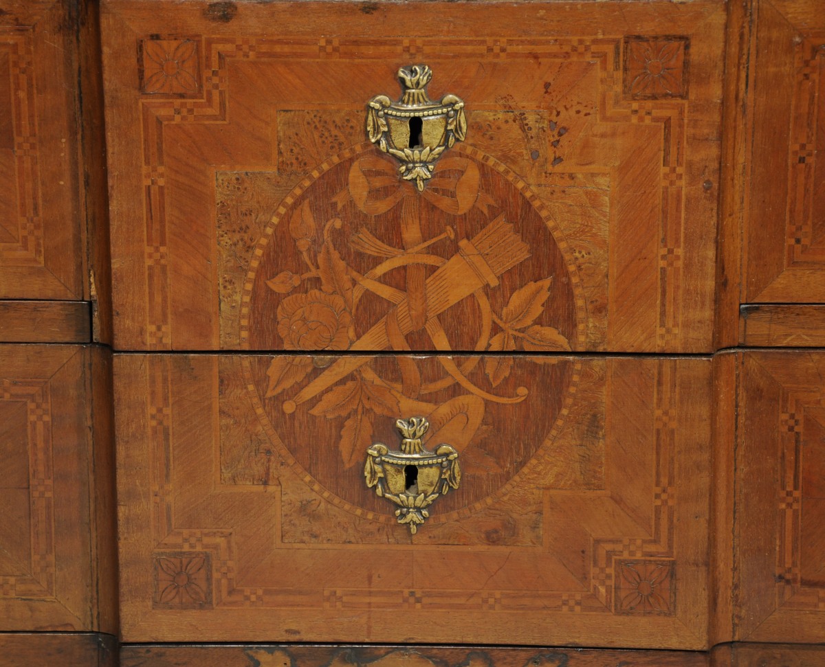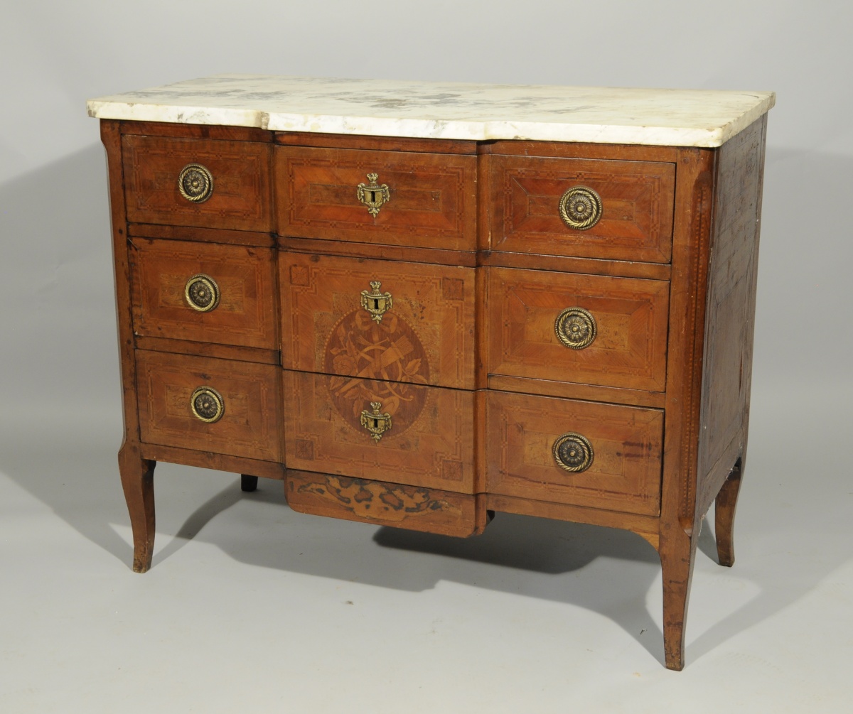 COMMODE à ressaut. Marqueterie de ronce de noyer, palissandre, sycomore teinté et bois fruitier. Ouvrant par trois tiroirs sur trois rangs. Médaillon central marqueté d'un trophée musical. Réserves à encadrement en marqueterie de cubes et fleurettes. Montants à pan coupé. Pieds galbés. Ornementation de bronze tels qu'anneaux de tirage et entrées de serrure. Sommé d'un marbre blanc.