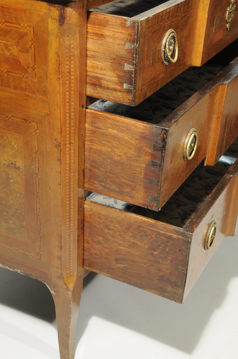 COMMODE à ressaut. Marqueterie de ronce de noyer, palissandre, sycomore...