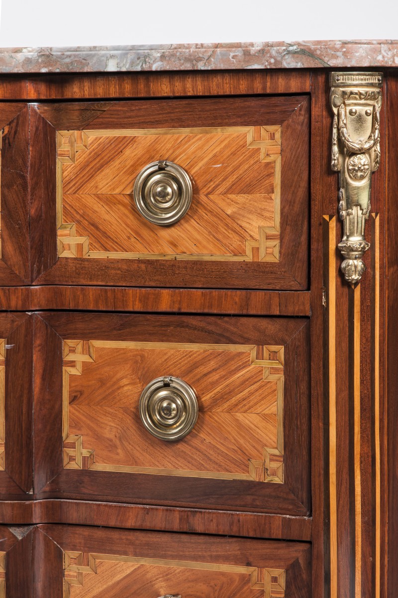 COMMODE à ressaut en placage en frise de bois de rose sur fond de bois de violette, dans des encadrements en bois teinté vert. Elle ouvre en façade par trois tiroirs sur trois rangs. Montants arrondis ornés de cannelures simulées et pieds galbés. La traverse basse chantournée. Ornementation de bronzes ciselés et dorés telle qu'entrées de serrure en médaillon, anneaux de tirage, chutes en forme de gaine, cul-de-lampe et sabots. Dessus de marbre rouge et gris à ressaut.