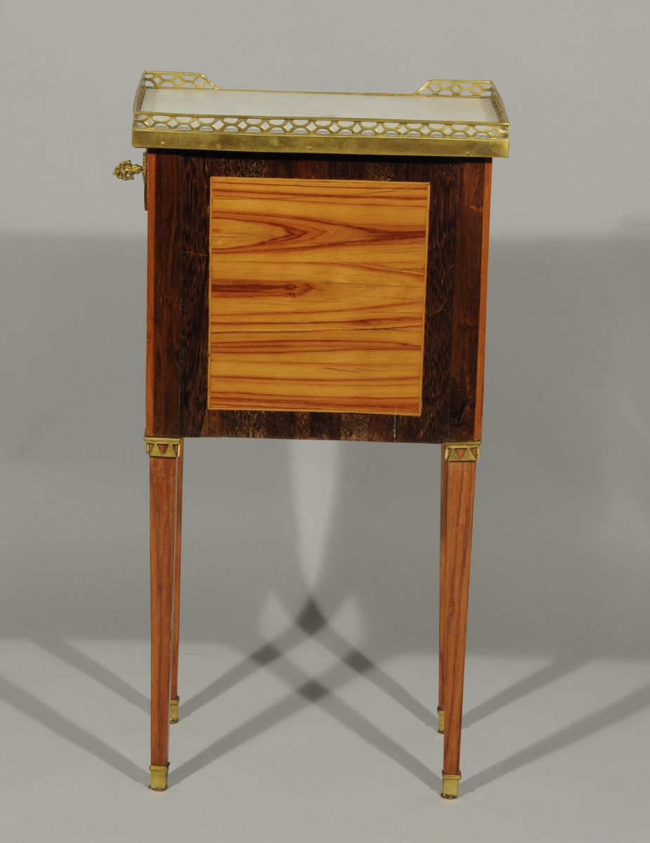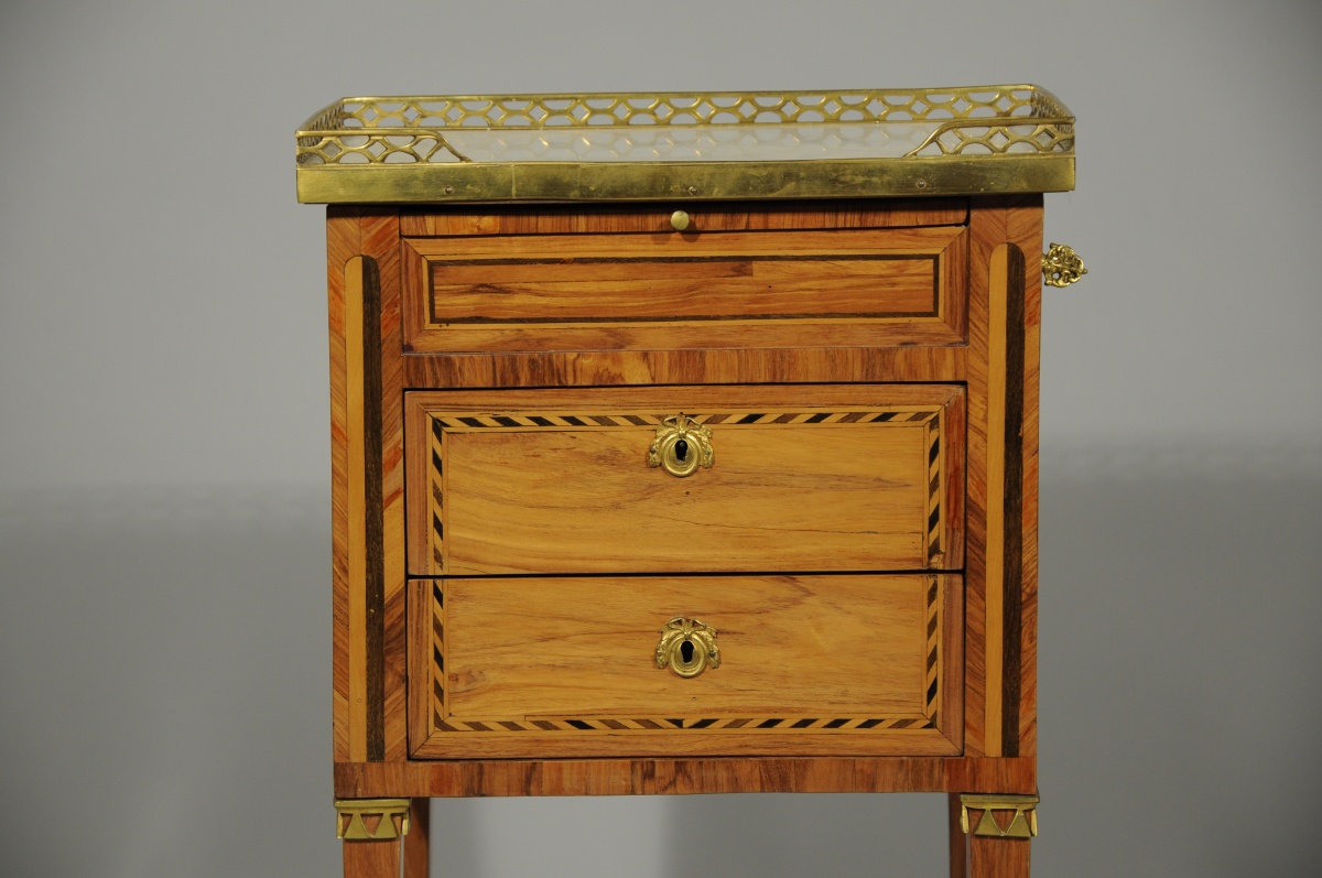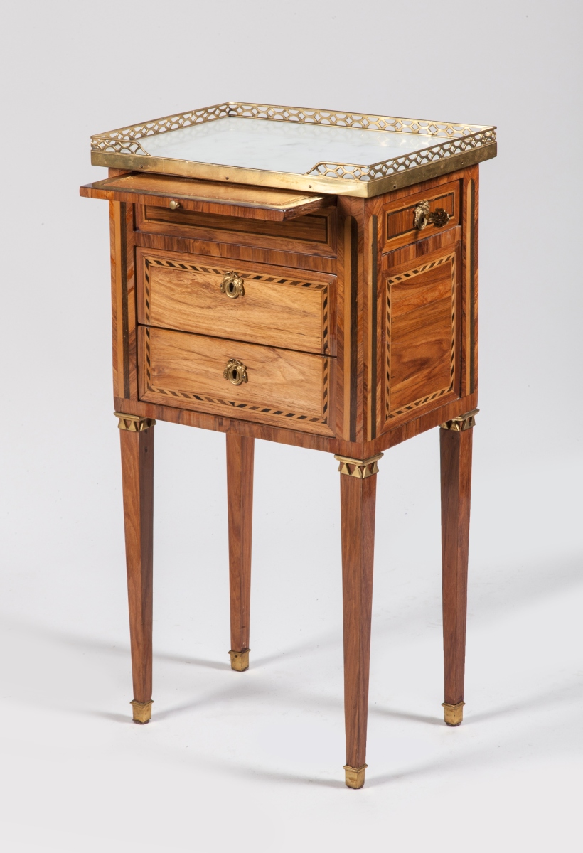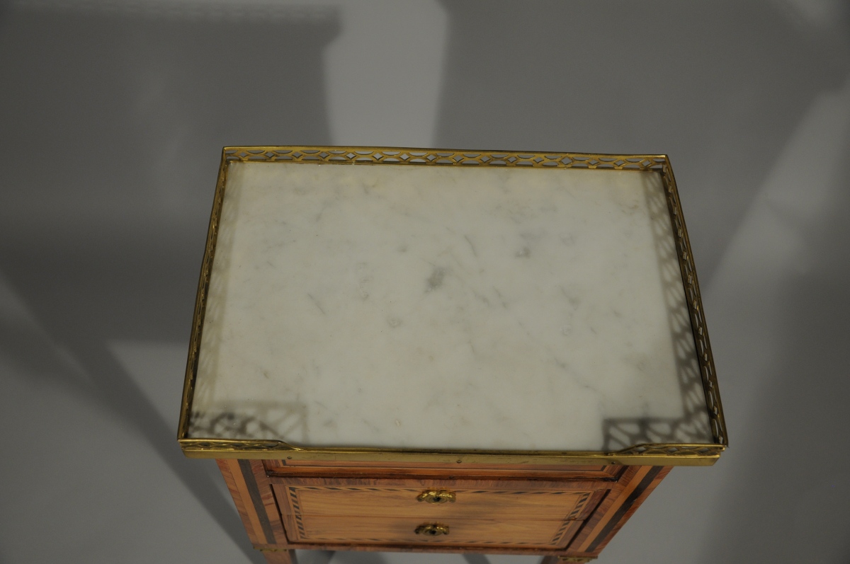 Petite TABLE VOLANTE marquetée toute faces de bois de rose ouvrant à une tirette et deux tiroirs sans traverse en façade et à un tiroir sur le côté. Marqueterie à motifs de colonnes cannelées et frises géométriques. Elle repose sur quatre pieds gaine. Dessus de marbre gris. Galerie de laiton ajourée.