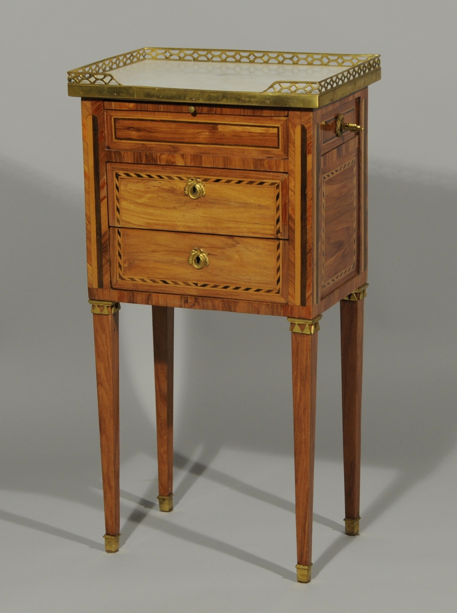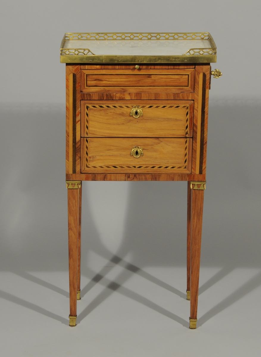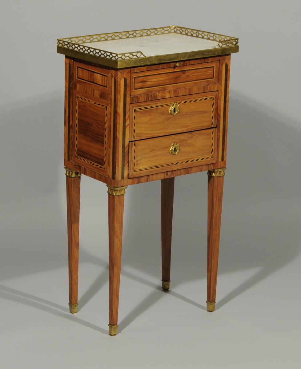 Petite TABLE VOLANTE marquetée toute faces de bois de rose ouvrant à une tirette et deux tiroirs sans traverse en façade et à un tiroir sur le côté. Marqueterie à motifs de colonnes cannelées et frises géométriques. Elle repose sur quatre pieds gaine. Dessus de marbre gris. Galerie de laiton ajourée.