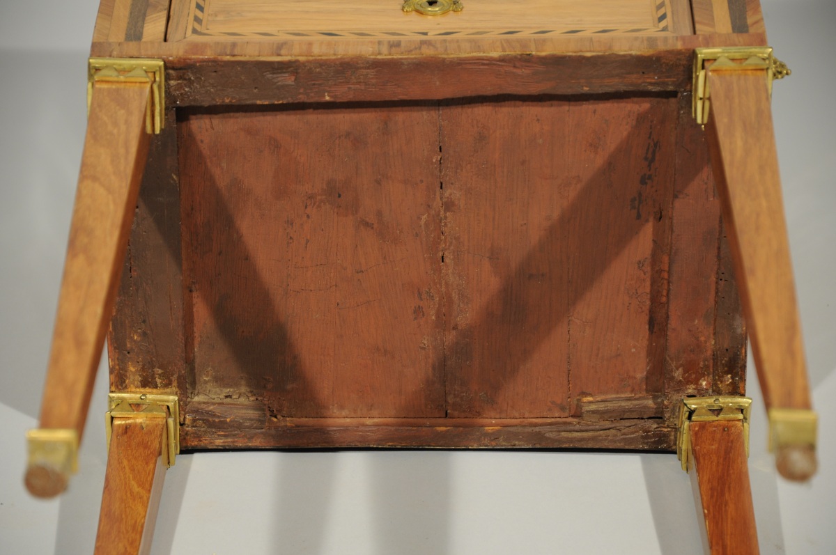 Garnitures de bronzes dorés à motifs de rubans pour les entrées de serrure, de chapiteau pour le haut des pieds et sabots.
