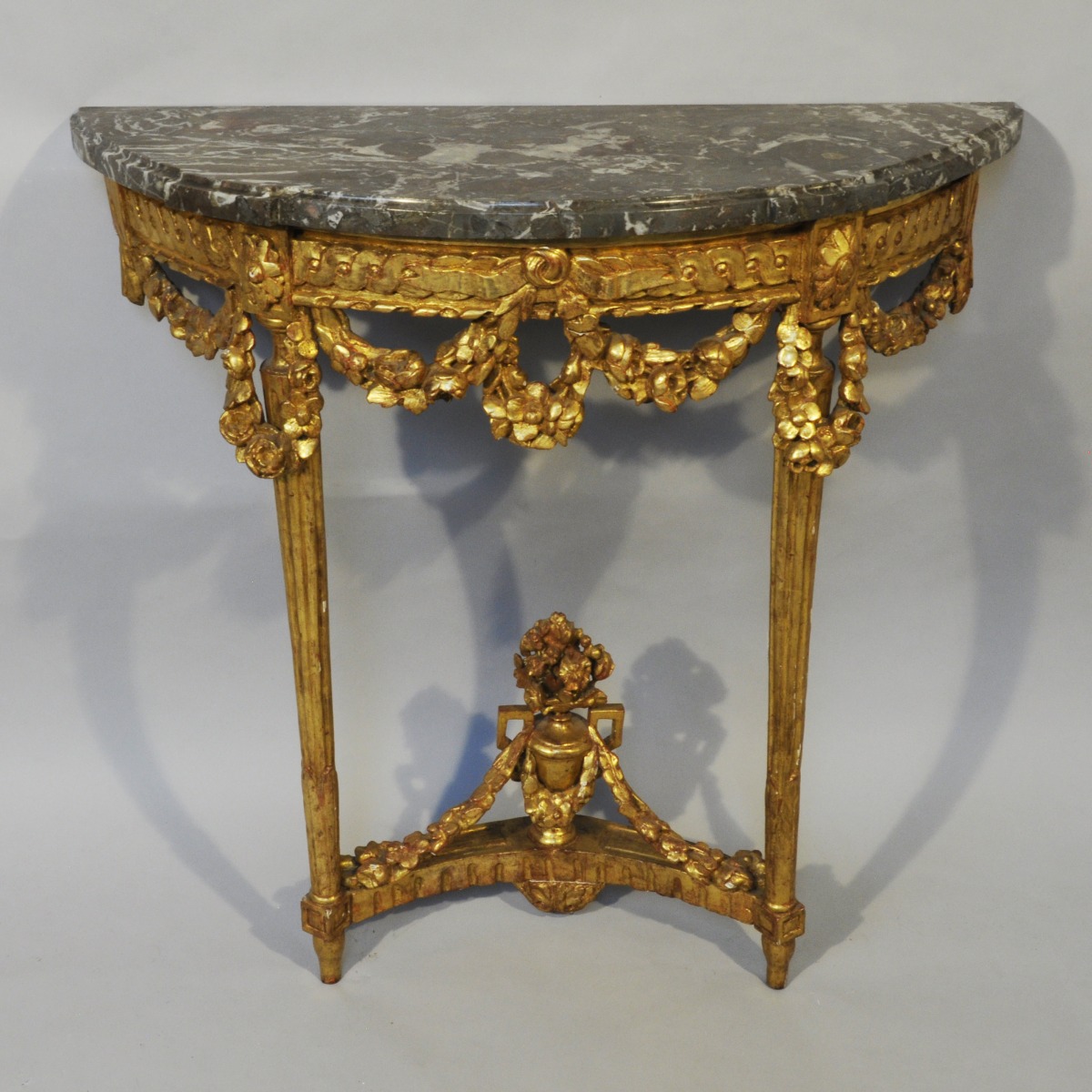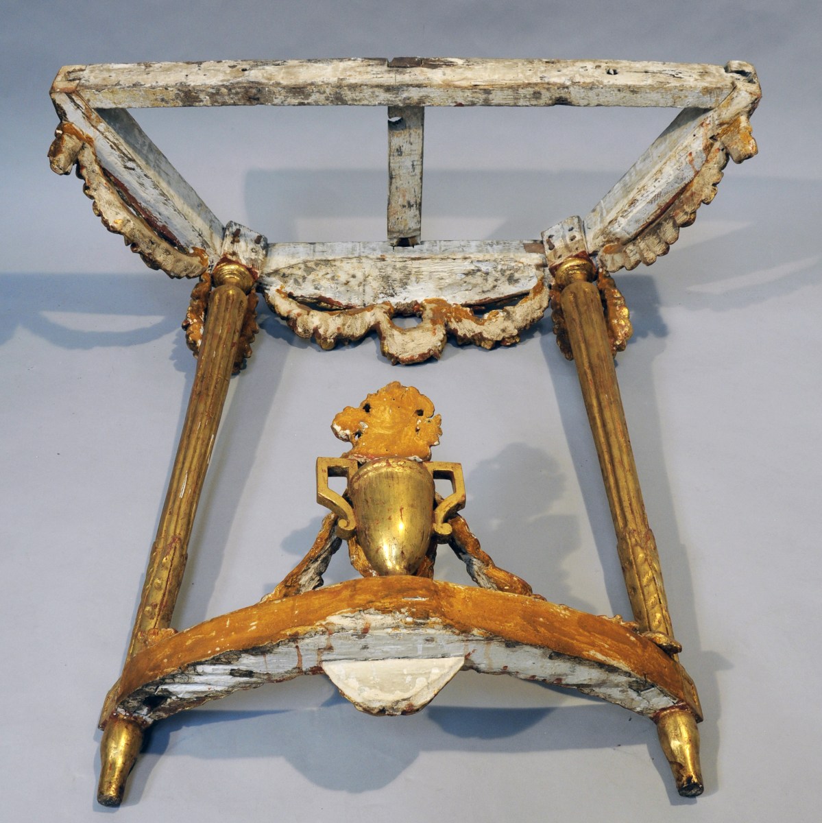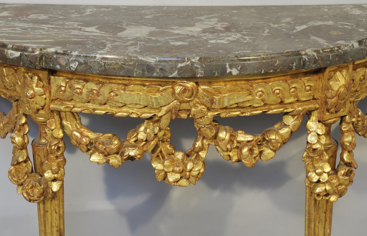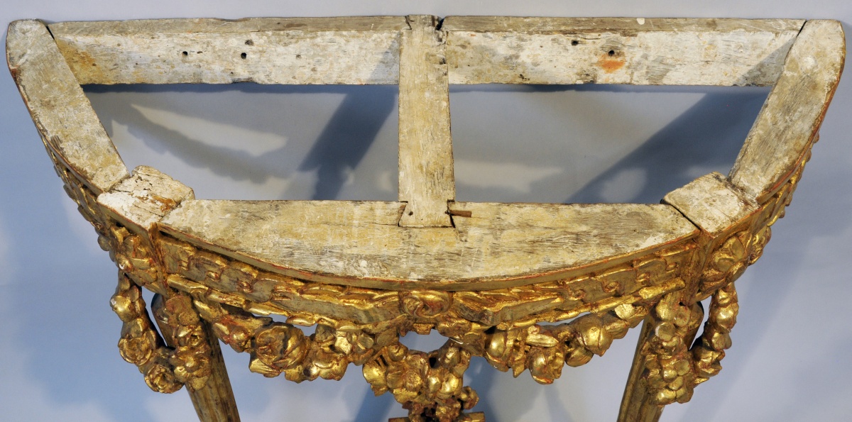 CONSOLE D'APPLIQUE de forme demi-lune, en bois doré et richement sculpté d'entrelacs, guirlandes, rubans et fleurs. Elle repose sur deux pieds fuseaux cannelés à pointes de lauriers réunis par un vase fleuri.
